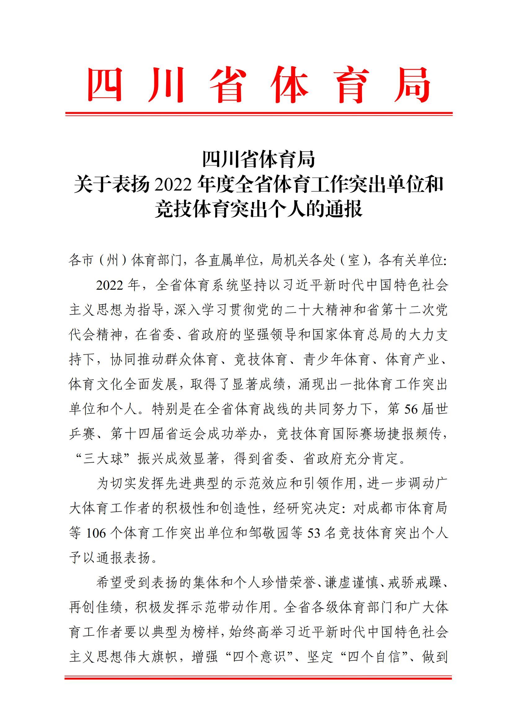 近日,四川省体育局通报表扬2022年度全省体育工作突出单位,beat365英国官方网站奥林匹克学校荣获体育工作突出单位称号。