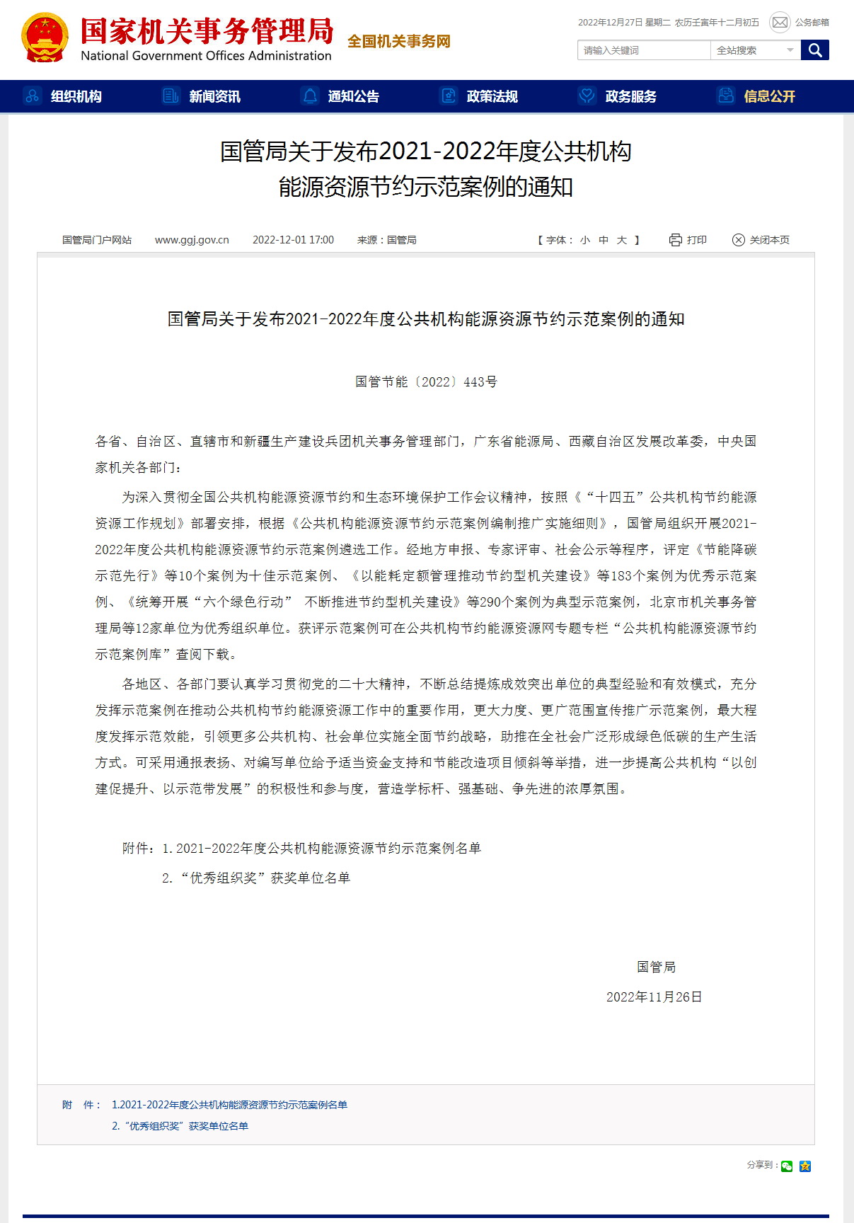 近日,国家机关事务管理局发布2021-2022年度公共机构能源资源节约示范案例,学院“做好节能降碳 助力绿色发展”案例荣获全国优秀示范案例。
