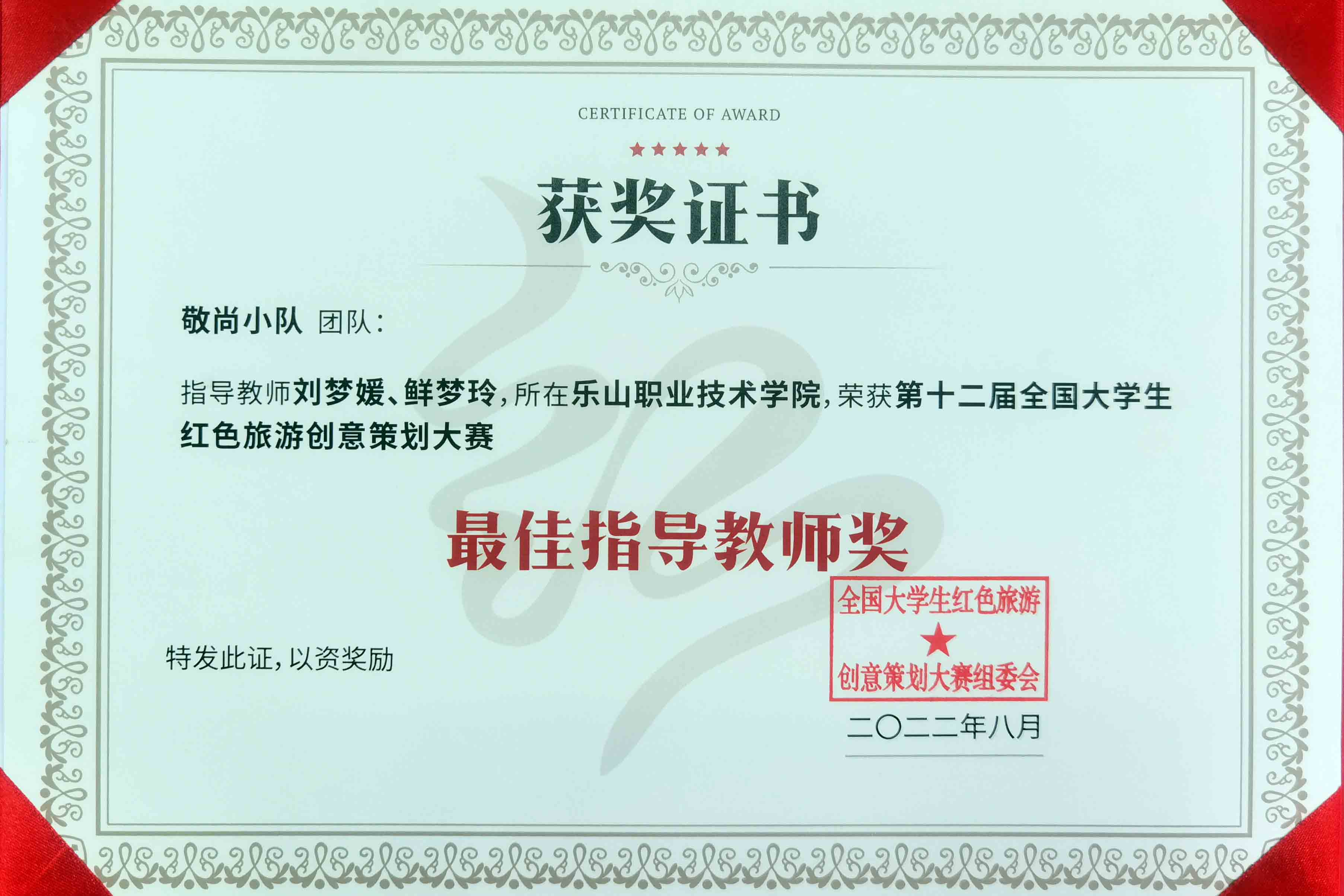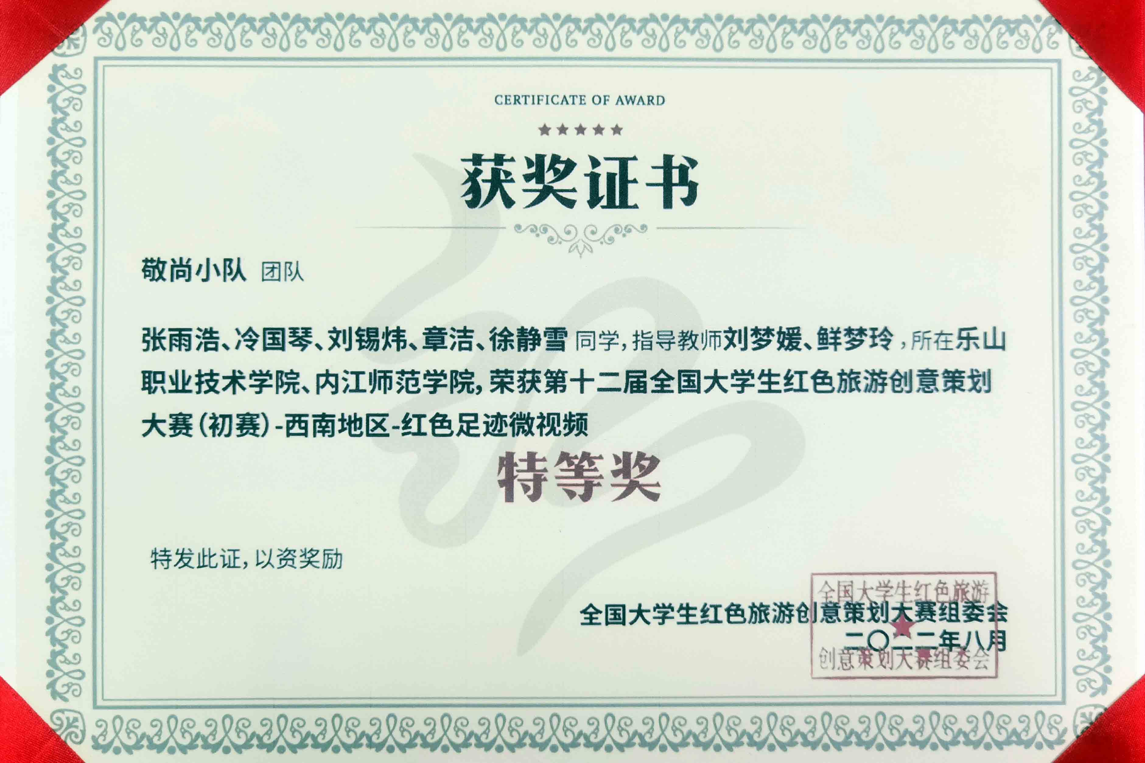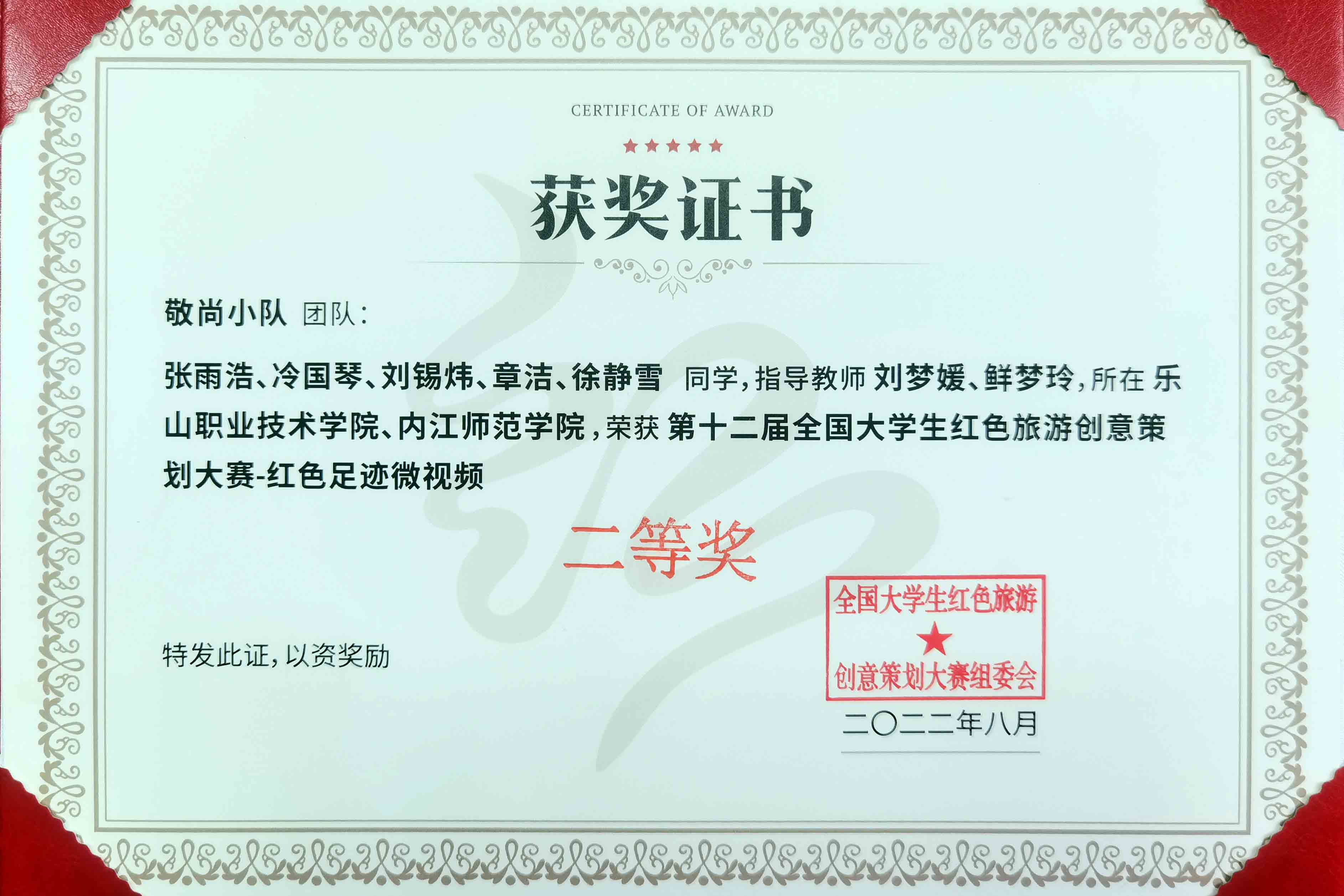 “敬尚小队”由beat365英国官方网站旅游系旅游管理专业2021级学生张雨浩、冷国琴、刘锡炜、徐静雪,内江师范学院体育教育专业2021级学生章浩5名同学组成,在旅游系刘梦媛、鲜梦玲及马克思主义学院刘晓锐等老师的指导下,从今年7月初开始备赛,经历了“讨论策划→制定方案→视频脚本→延安采风→后期制作→完善资料→答辩排练”等过程,8月中旬形成了完整的参赛作品《勠力同心播火种 抗大精神在延安》微视频,在西南赛区“红色足迹微视频”赛道组荣获“特等奖”并进入全国总决赛。在全国总决赛中,最终取得“第十二届全国大学生红色旅游创意策划大赛-红色足迹微视频”二等奖的优异成绩,刘梦媛、鲜梦玲老师获得“最佳指导教师奖”的殊誉。