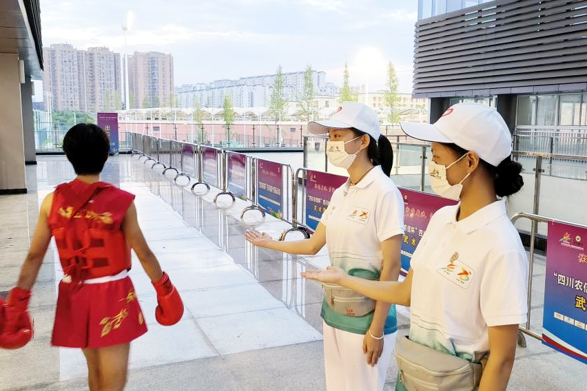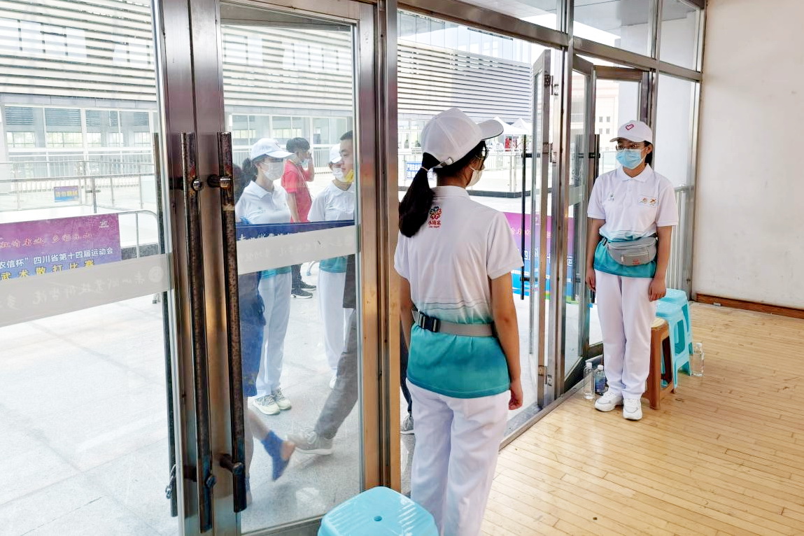 “您好,请出示健康码、行程码”“请测体温出示核酸检测报告”志愿者严志勇是一名大二学生,在场馆外负责检查健康码工作。在36°C的环境下,他此刻已经是汗流浃背,“天气炎热,我们就提前喝一瓶藿香正气水,能为省运会服务我感觉非常开心”。