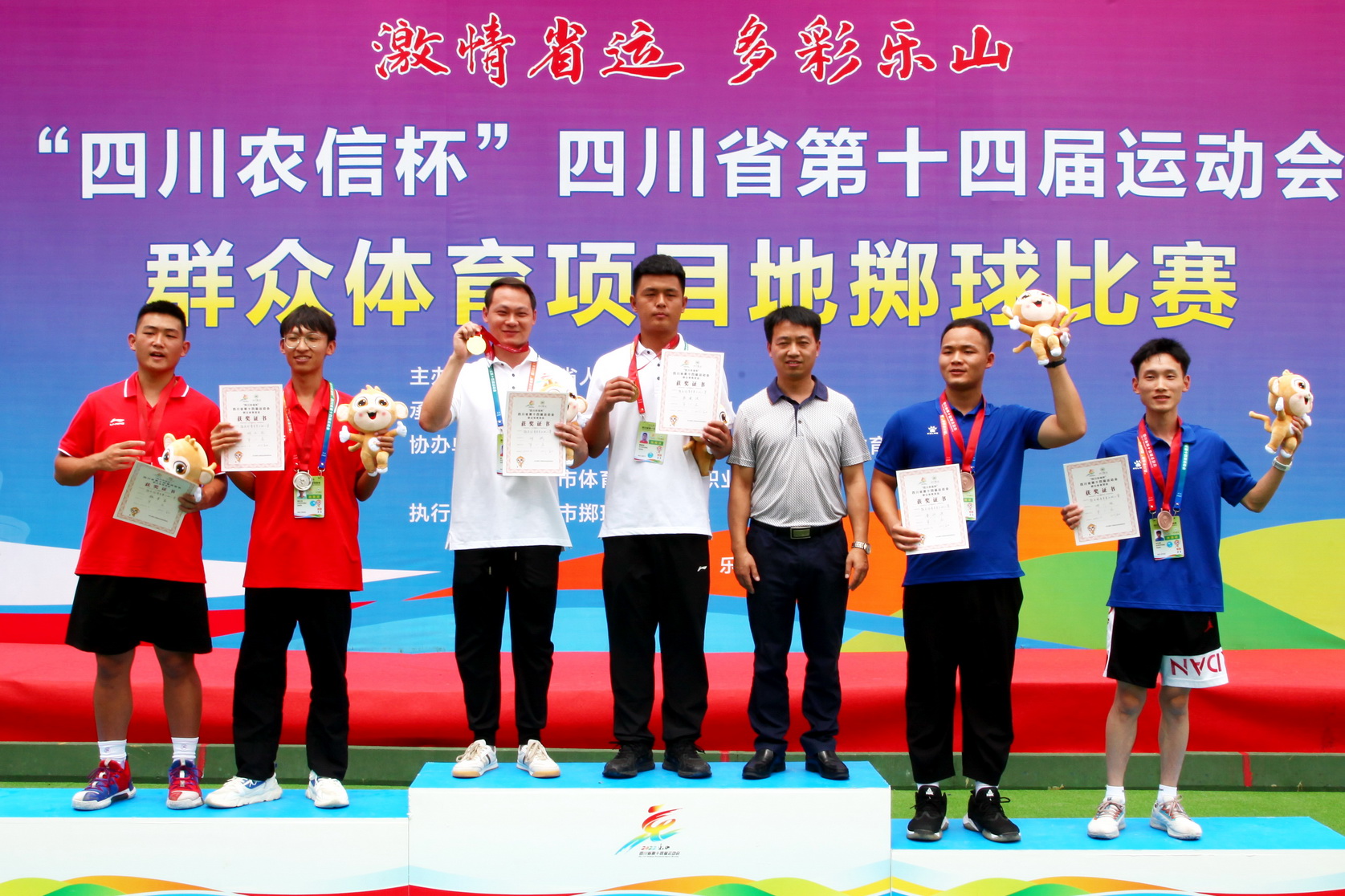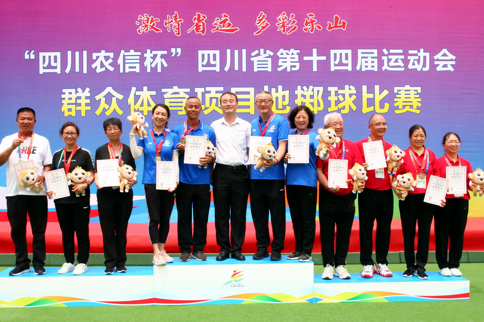 6月25日,在小金属球中年女子三人赛中,由乐职院教师姜腾东、黄梅、朱红、杨莉频四人组合参赛,在比赛中多次上演逆袭大戏,在比分6:9和2:8落后的情况下,发扬顽强拼搏的精神,最终以11:9和11:8的比分获得胜利,为乐山队夺得该项目第一金。