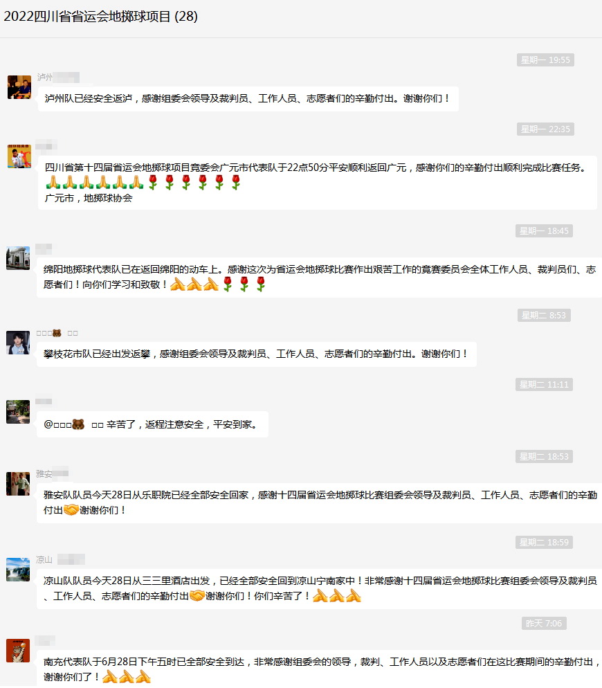 6月27日,四川省第十四届运动会群众体育项目地掷球比赛圆满结束,各地市州代表队在返程途中表示对学院此次承办的赛事表示非常满意,感谢地掷球比赛组委会领导及裁判员、工作人员、志愿者们的辛勤付出,保证了赛事的顺利进行。