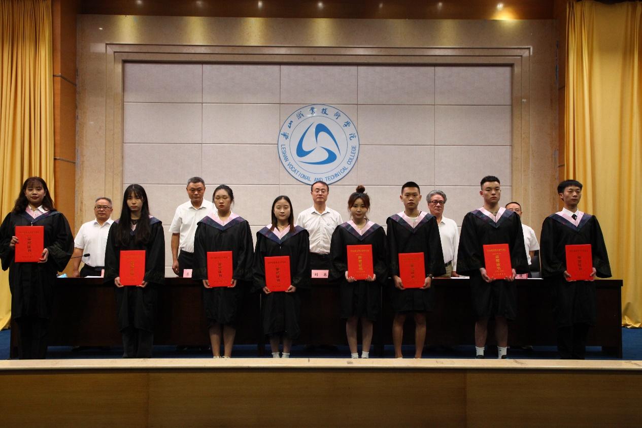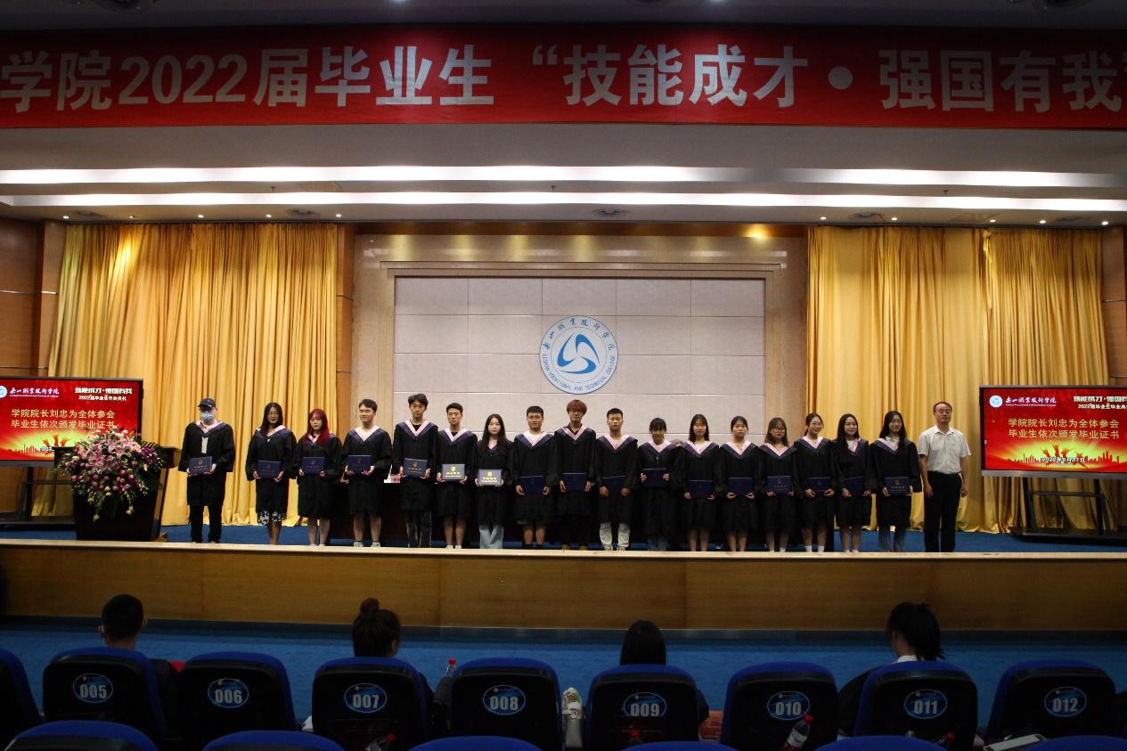 典礼上,学院副院长陈元进宣读了《关于公布2022届四川省级优秀大学毕业生认定结果的通知》,我院共有140余名同学获此殊荣。8名省级优秀大学毕业生代表上台从全体院领导手里接过荣誉证书,也接过了一份独属“乐职学子”的光荣传承。