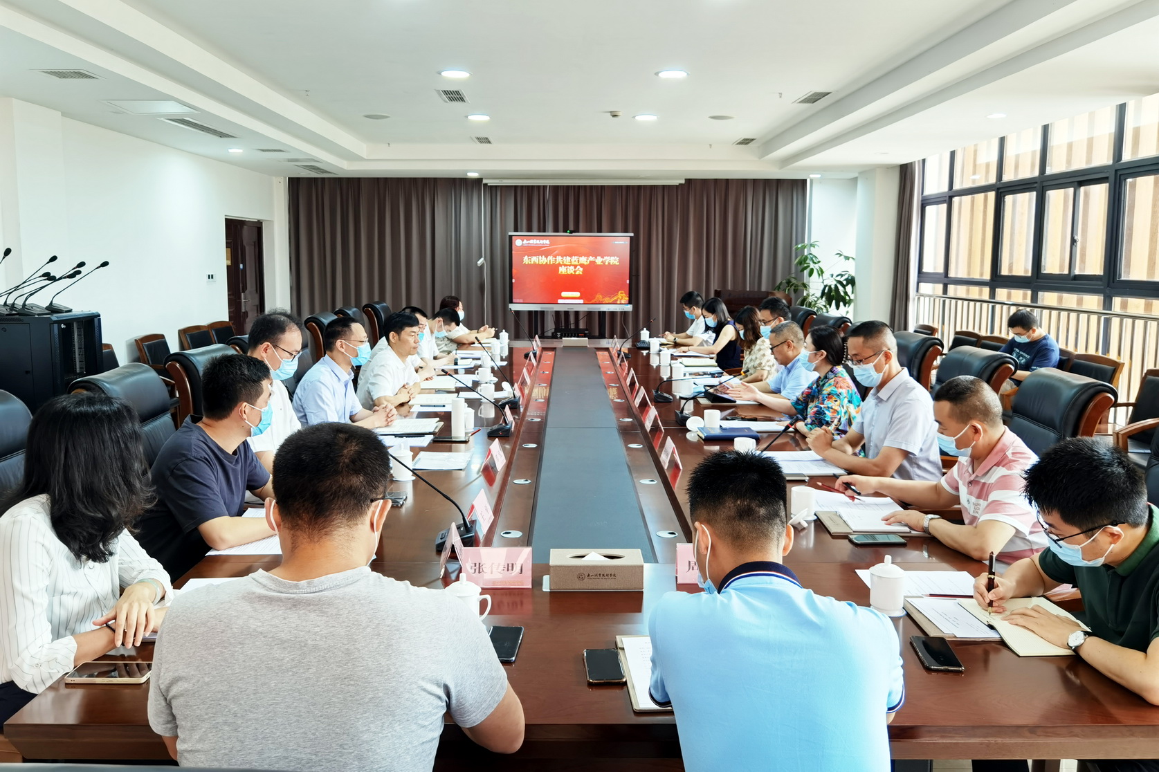 6月24日上午,东西协作共建蓝鹰产业学院座谈会于我院召开。学院党委会委员、副院长张学河出席座谈会,四川省乐山市马边彝族自治县委常委、副县长沈水梫,浙江省绍兴市越城区人力资源和社会保障局党组成员、副局长陈剑一行13人及绍兴市11家企业代表在线上线下参加会议。本次会议由教务处处长陈晓露主持,教务处、新能源工程系、机电工程系、旅游系相关领导参加了座谈会。
