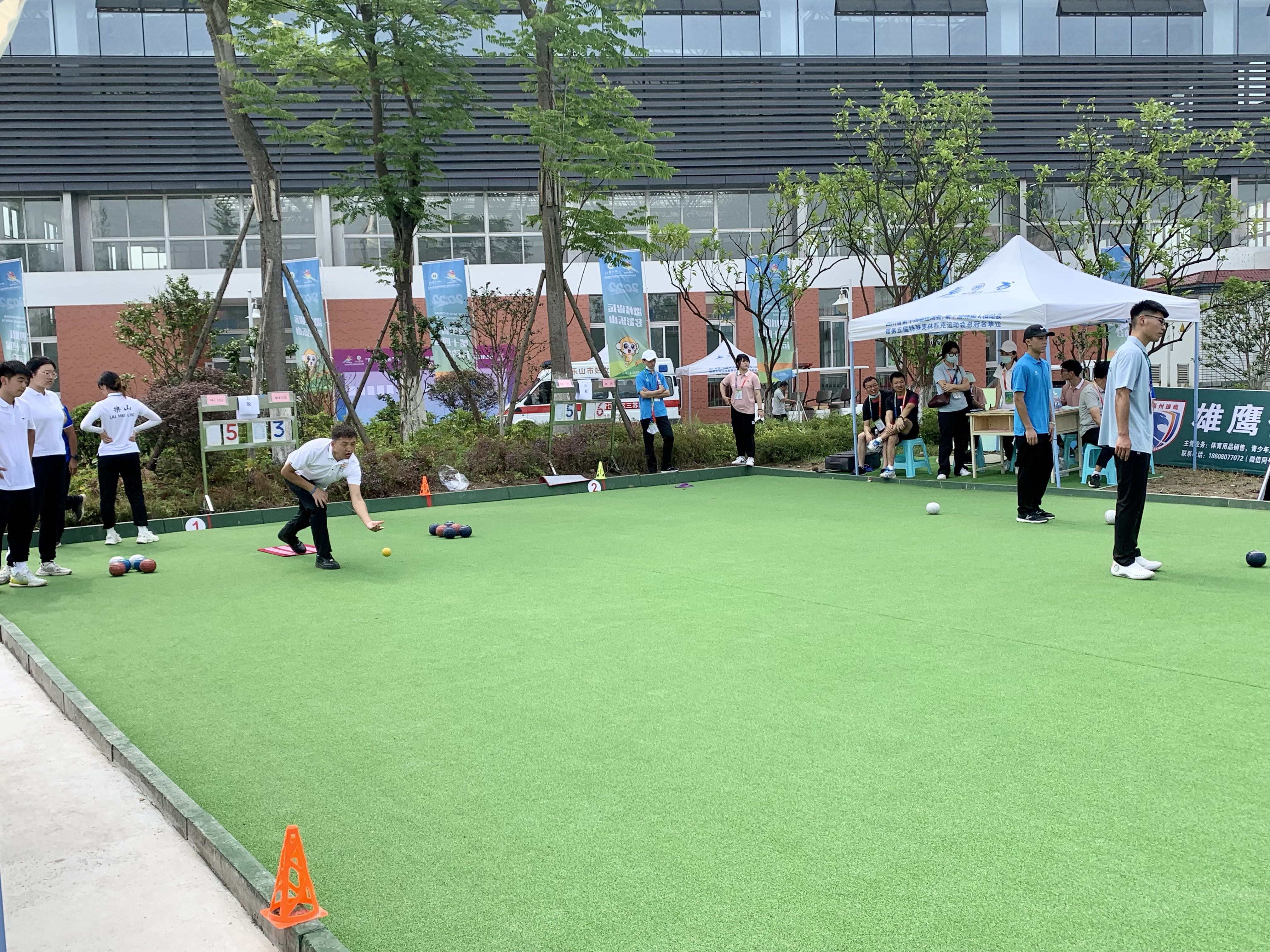 比赛现场,选手们沉着冷静,目光坚定,以优雅沉稳的姿势、坚定有力的动作将一颗颗球或滚或抛,大小球在赛场上划出优美的弧线,精准得分。