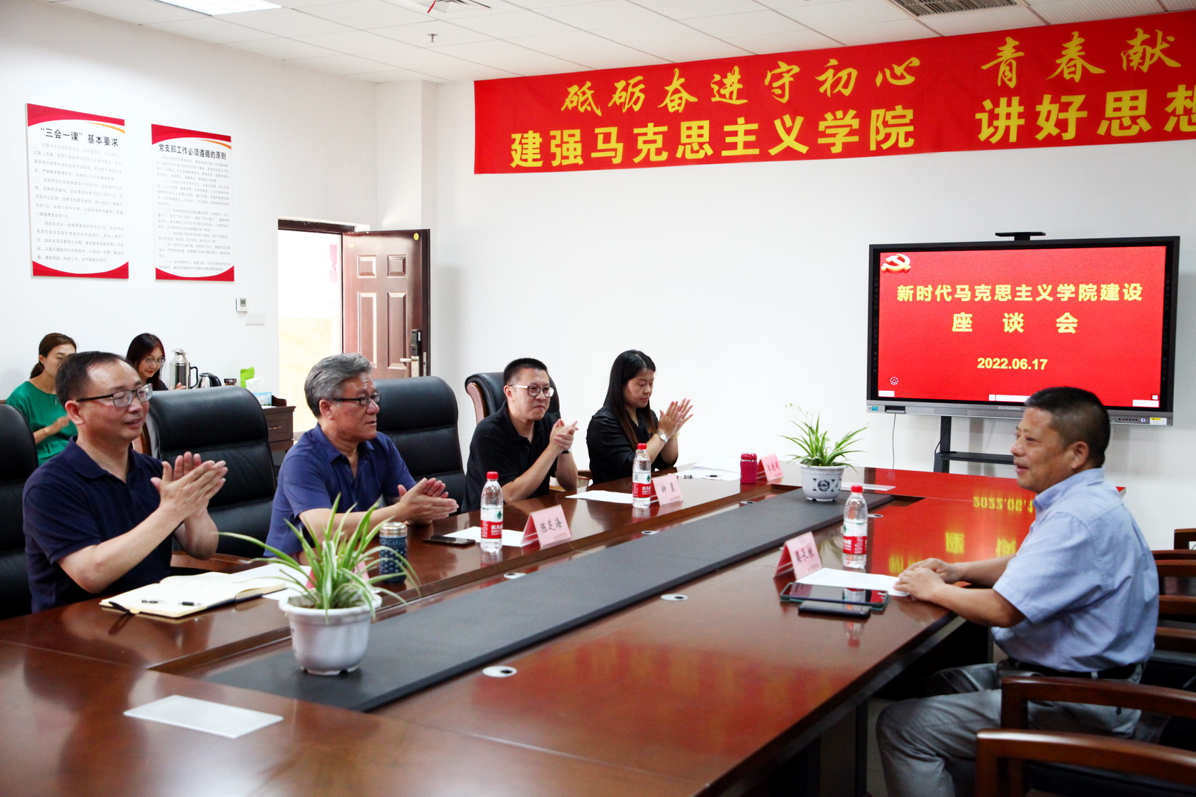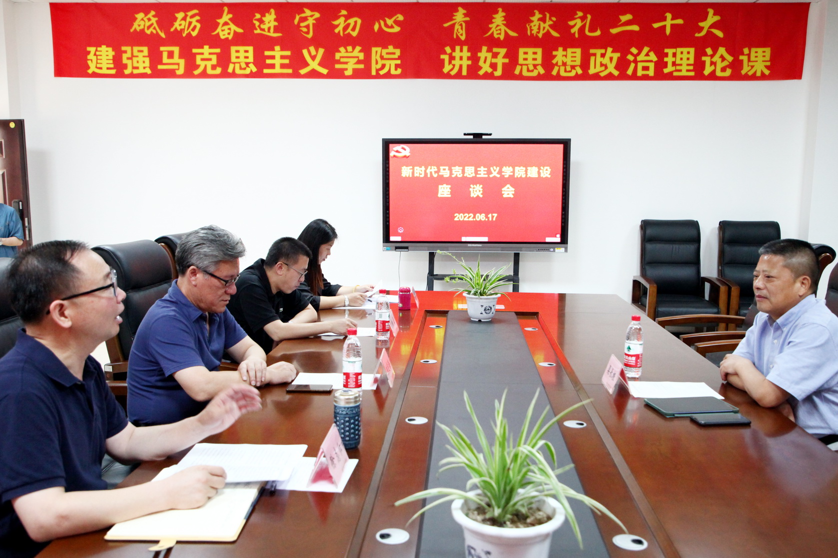 2022年6月17日上午,新时代马克思主义学院建设座谈会在1号教研楼410会议室举行。浙江理工大学红色文化研究院院长、beat365英国官方网站“青江学者”渠长根教授,学院党委副书记陈芝海,宣传部部长钟翼以及马克思主义学院领导班子和教师代表参加座谈。会议由钟翼主持。