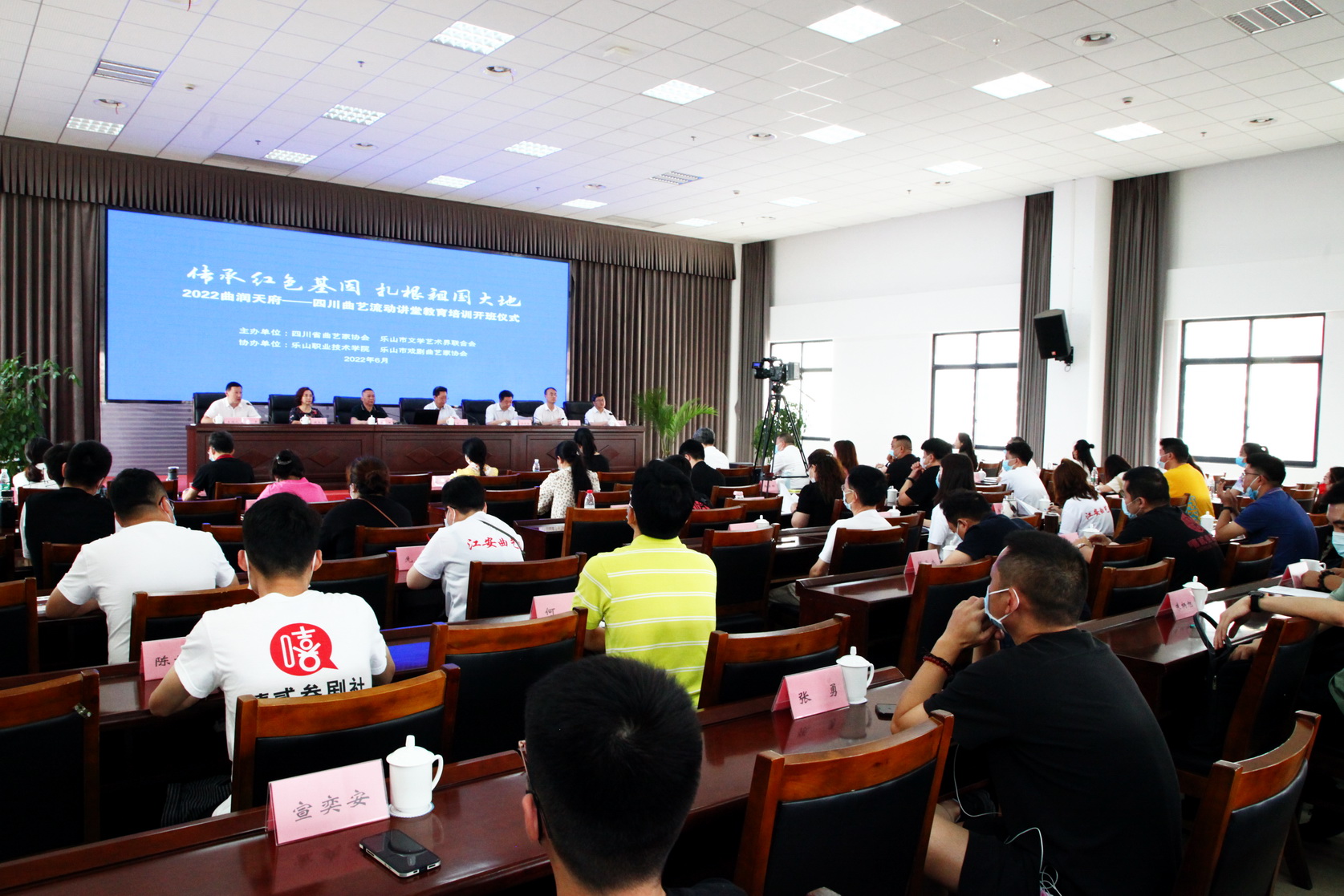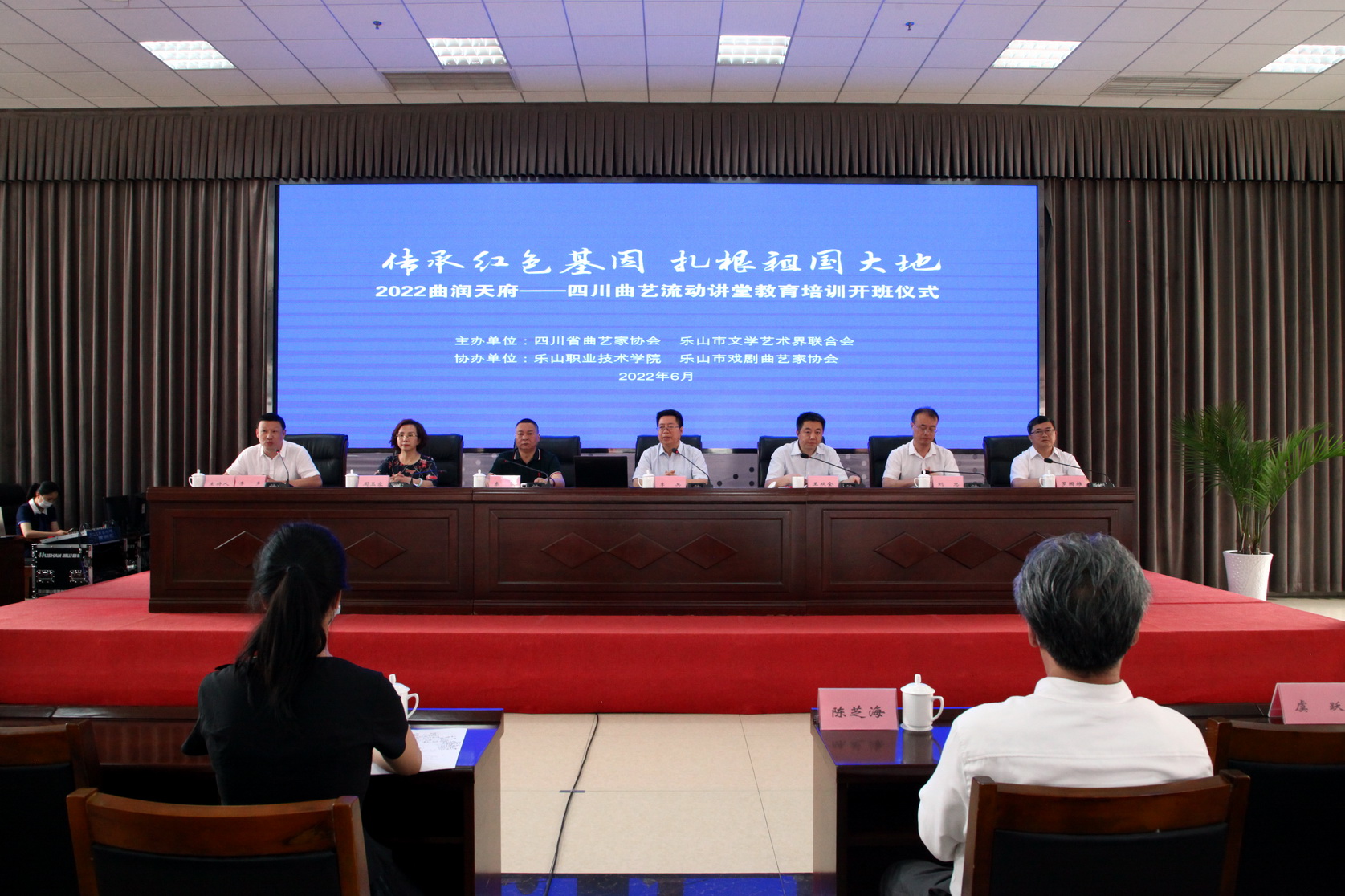 6月13日,由四川省曲艺家协会、乐山市文联主办的“传承红色基因 扎根祖国大地”2022曲润天府——四川曲艺流动讲堂教育培训,在beat365英国官方网站开班。省文联党组副书记、副主席李兵,市委常委、宣传部部长王双全,省曲艺家协会副主席、巴中市政协副主席秦渊,学院院长刘忠、党委副书记陈芝海出席开班仪式。