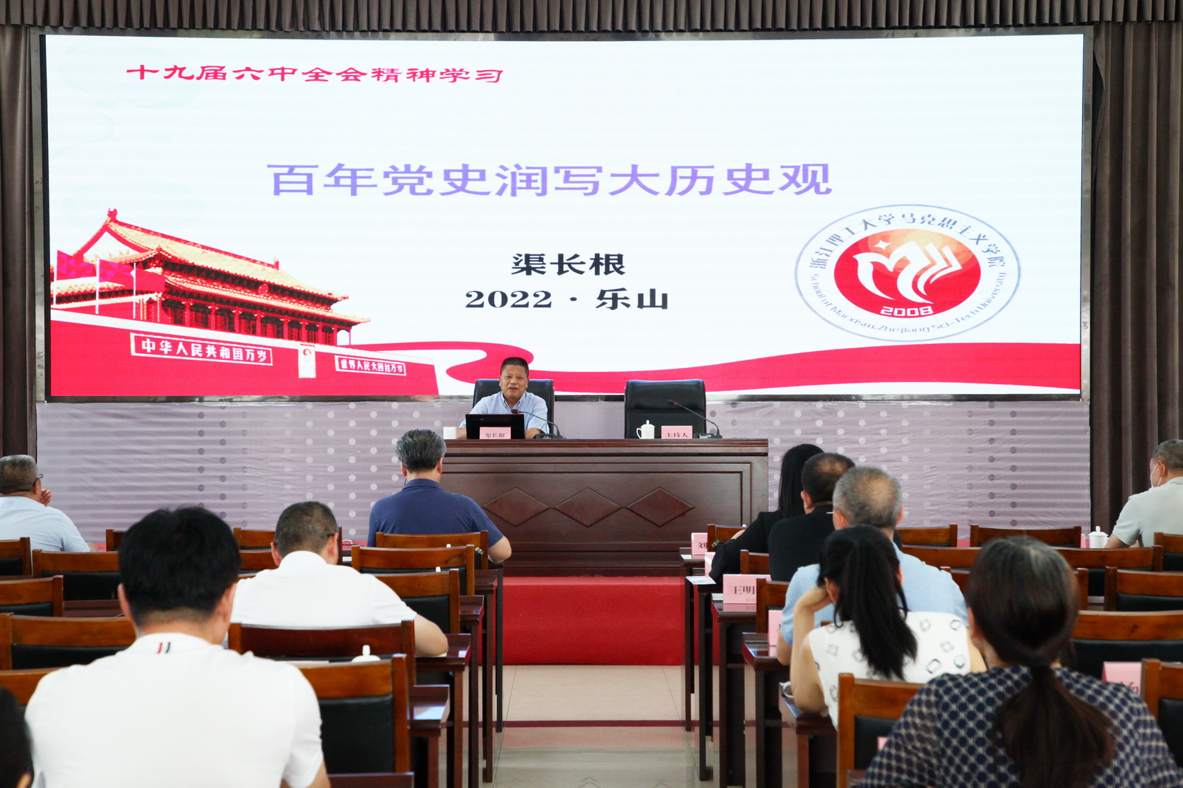 2022年6月17日下午,“百年党史润写大历史观”干部专题培训在学术交流中心3004会议厅举行。学院领导、中层干部、部分教师参加讲座。此次培训依托“青江大讲堂”平台,邀请浙江理工大学马克思主义学院渠长根教授作了主题为《百年党史润写大历史观》的专题讲座。会议由学院党委副书记陈芝海主持。