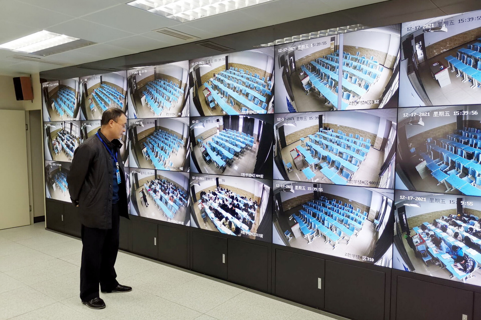 为全方位掌握学院期末教学开展情况,夯实教学主体责任,把关课堂教学质量,12月17日下午,学院院长刘忠在行政楼101监控室开展线上听课巡课工作,检查监控室日常运行和设施设备维护情况,推动多元化教学质量督查。陪同督查的还有党政办副主任任自力、院级督导李群英、教师代表胡小冬。