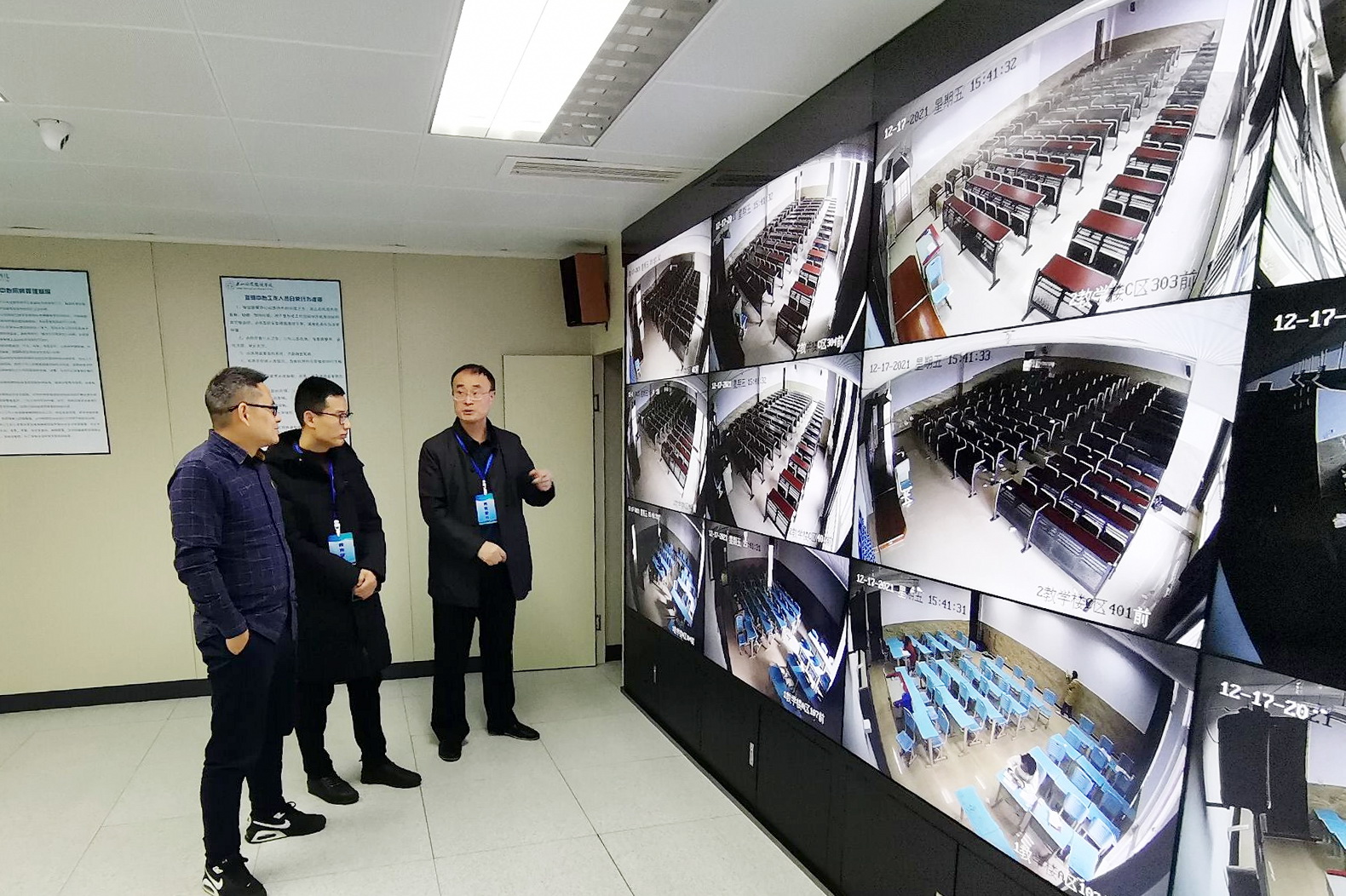 随后,刘忠详细检查了监控室日常运行和设施设备维护情况。刘忠强调,要维护并利用好学院教学视频监控系统,掌握课堂教学动态,加强教学过程管理,诊断和分析课堂教学质量、教风和学风,切实提升课堂教学质量。