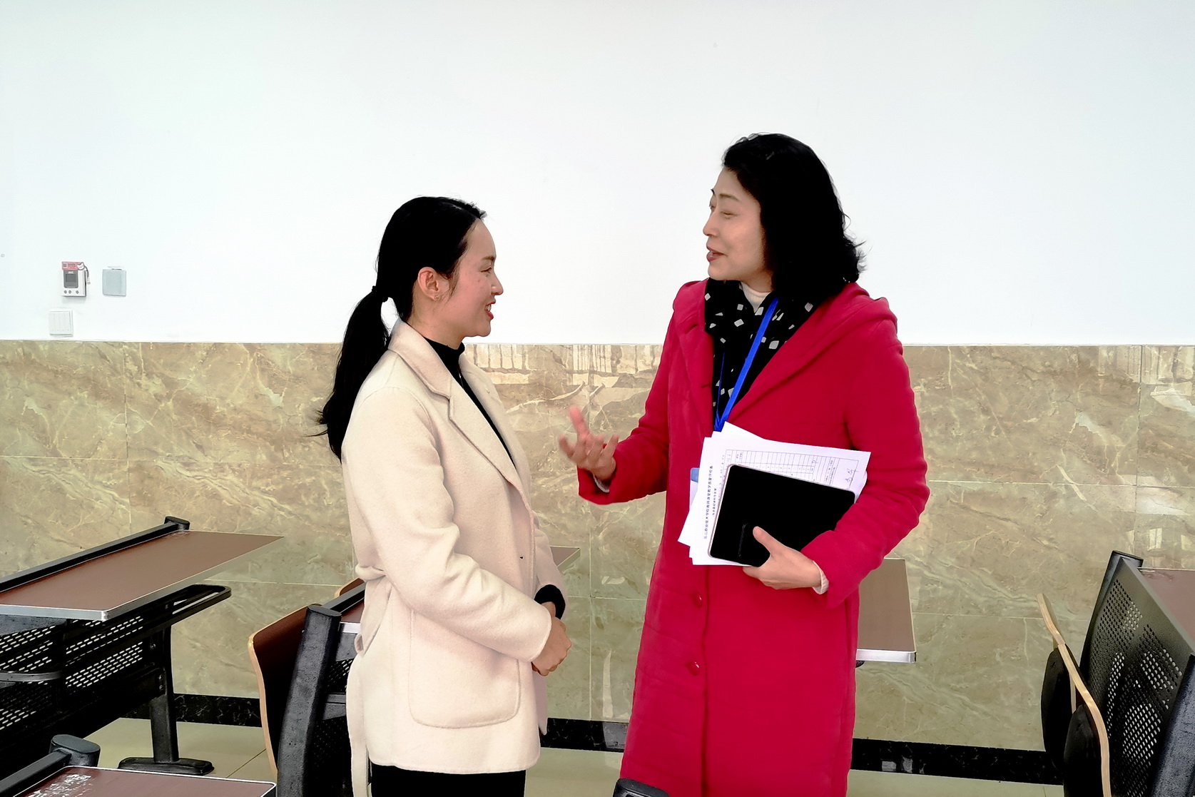 易群就教师教学环节掌握、教学方法运用、课程资料准备和课堂气氛调动等方面与两位老师进行了交流探讨,对两位老师的教学效果表示肯定。她强调,老师上课要充分结合教学班专业特点,选取身边接地气的案例,让学生听得更加入耳、入脑、入心、入行,产生共鸣。她希望广大教职员工不忘“教书育人、立德树人”初心,担起“为党育人、为国育才”使命,以学院办学70周年为新起点,坚持用真情、用思想、用知识、用技能、用精神的力量为党和人民培养德智体美劳全面发展的建设人才。
