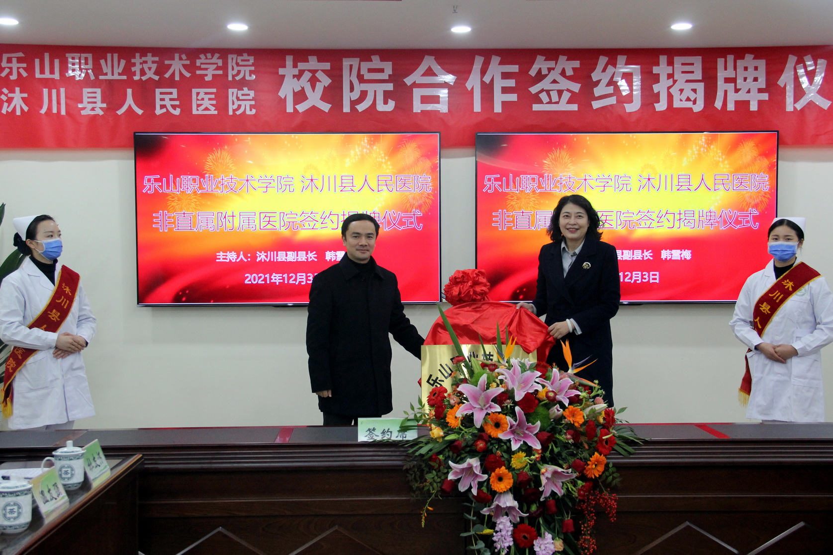 为贯彻落实教育部、财政部《关于实施中国特色高水平高职学校和专业建设计划的意见》精神, 坚持产教融合,实质推进协同育人,精准对接区域人才需求,推动高职院校和行业企业形成命运共同体,本着资源共享、互利互惠的原则,2021年12月3日,学院党委书记易群带队一行7人赴沐川县人民医院签约“非直属附属医院”并揭牌。