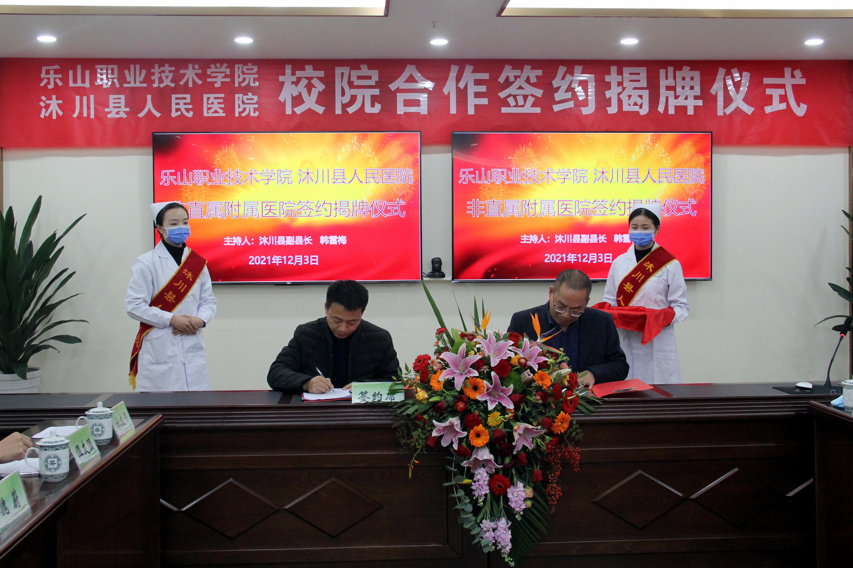 参加签约仪式的有学院党委书记易群,副院长封家福,沐川县委副书记、县长赵星,县委常委、宣传部部长魏蔚,副县长韩雪梅,县卫健局党组书记、局长温友强,县人民医院党委书记李彦锋,县人民医院党委副书记、院长杜友怀以及县人民医院党政班子全体成员,两家单位的中层干部等。