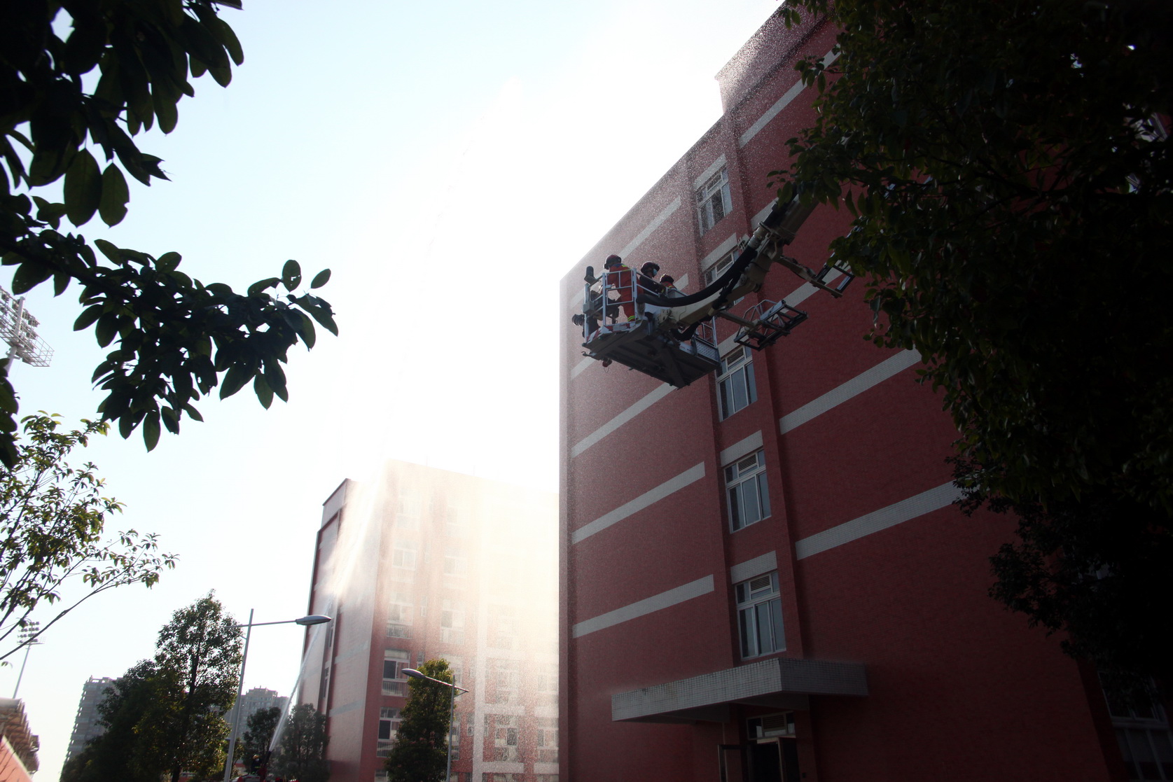 14时30分,火灾警报声响起,各楼宇内师生员工迅速拿起毛巾捂住口鼻有序撤离,学生从宿舍迅速撤离主运动场,各楼宇教职员工按照就近就便的原则,撤离到楼宇外的安全区域。