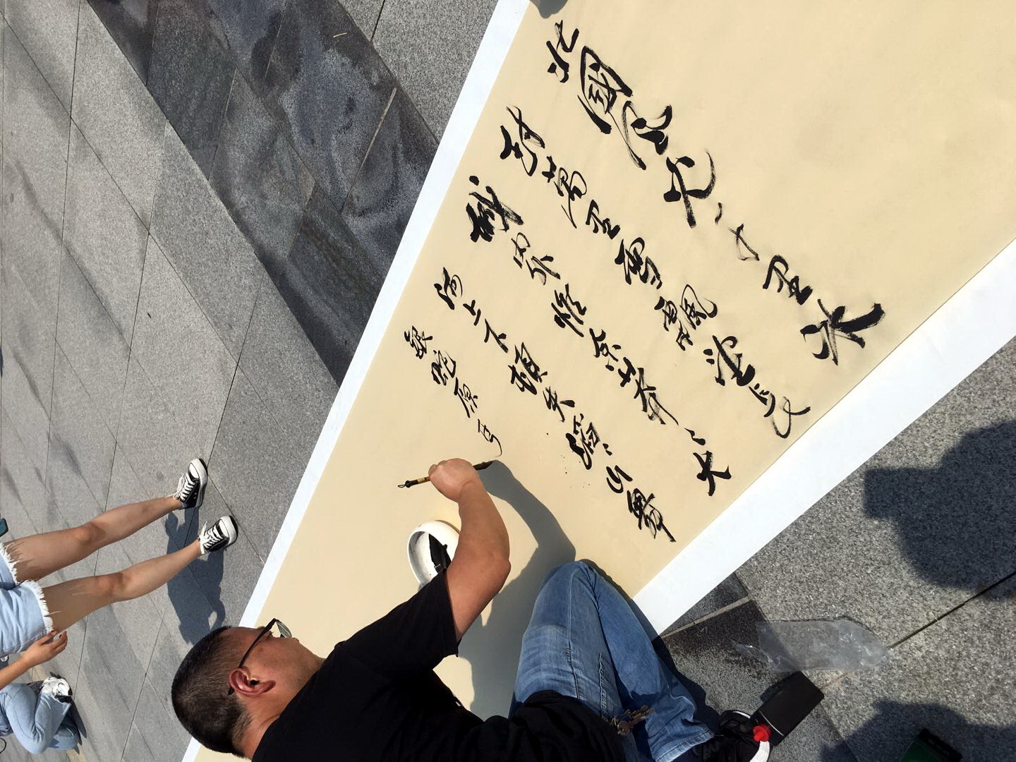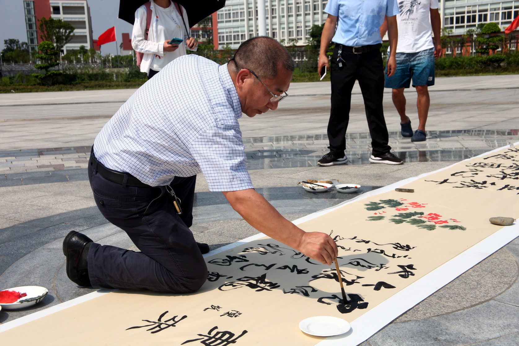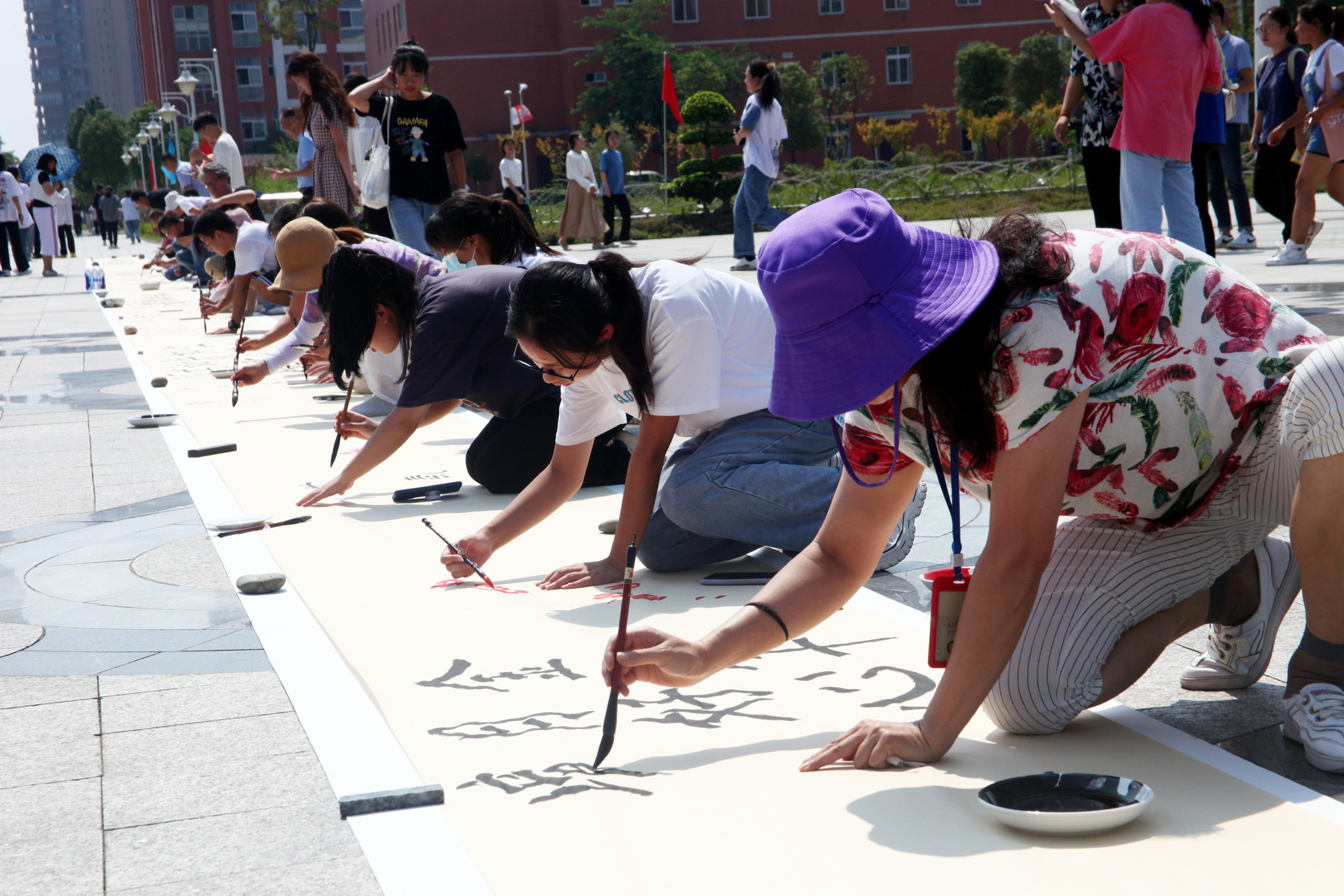 金秋时节,骄阳当空。约中午12时许,两条雪白的百米长卷在明德广场前展开。学院书画协会的会员老师们和若水墨韵书画社的同学们提前做好了相应准备工作。活动开始,书画协会的几位老师在长卷首端一人一字,依次写下“我爱您 亲爱的祖国”八个榜书字,接着,会员师生们各就各位,泼墨挥毫,尽显风采!“龙腾盛世”“江山如此多娇”、“数风流人物还看今朝”“神女应无恙,当惊世界殊”“华夏情”“中国梦”……一幅幅遒劲的书法书写着师生们爱国爱党的激情,澎湃着中华儿女的自信与豪迈。