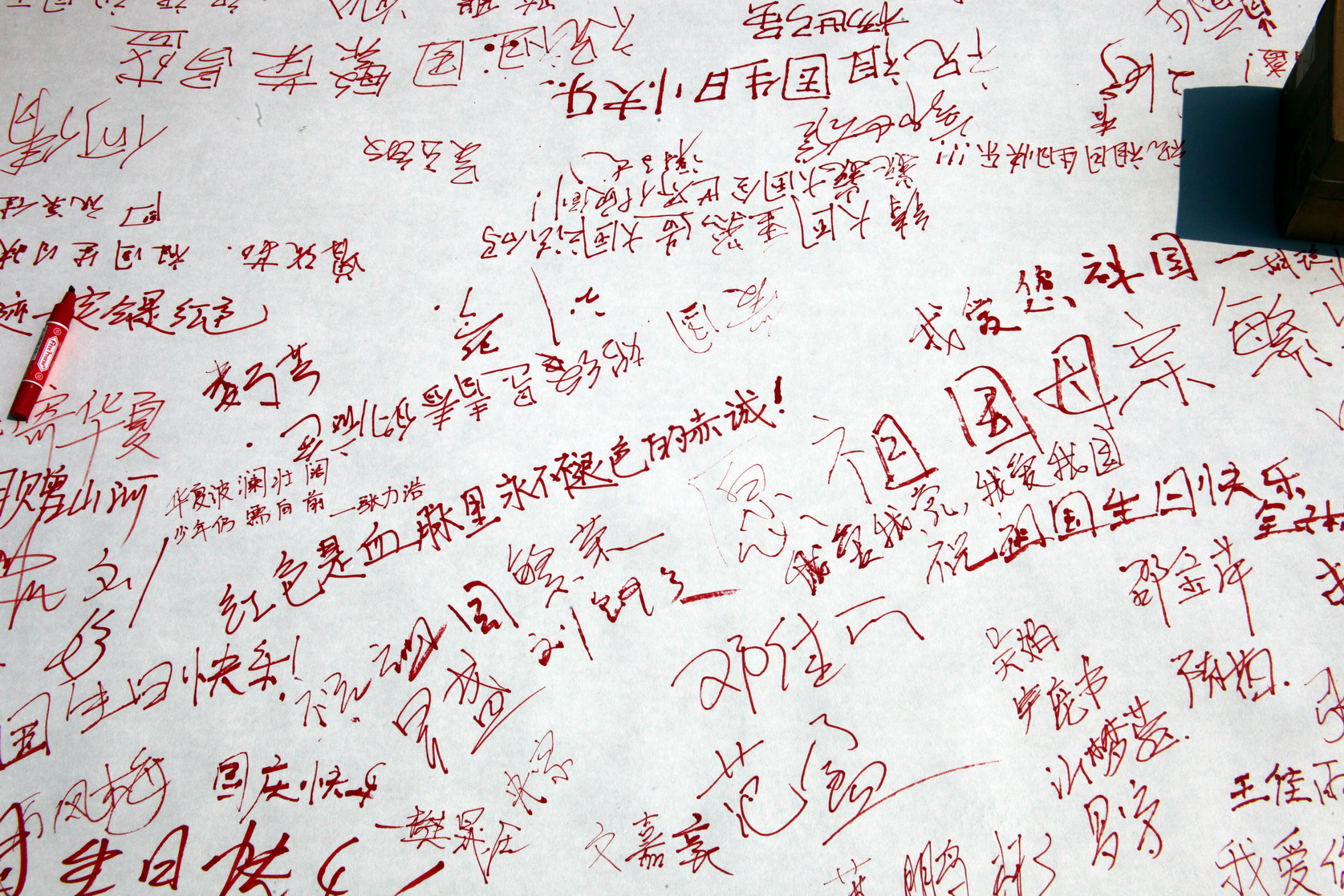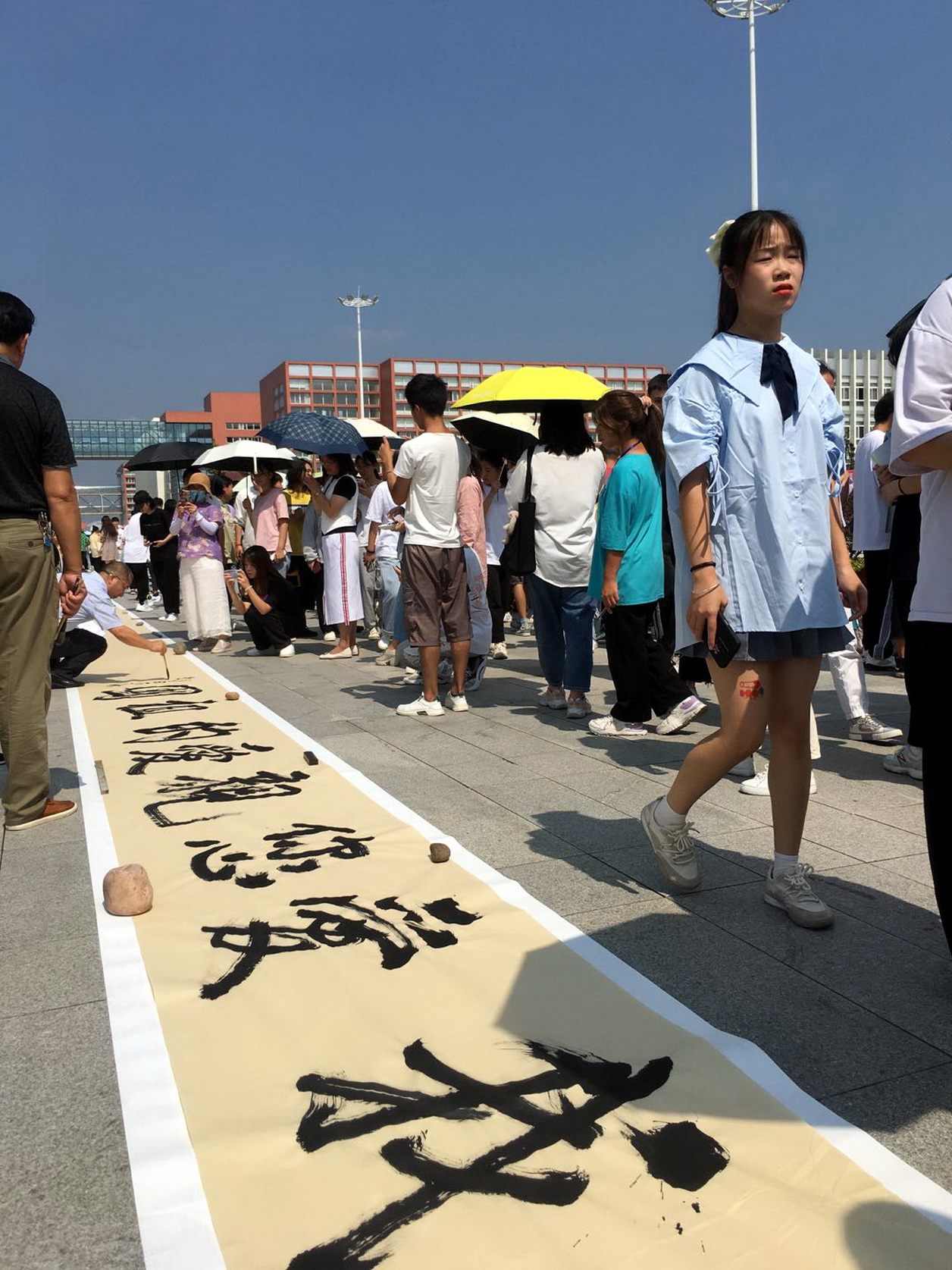 中午参加活动的师生们簇拥在明德广场,有的认真观摩现场书画创作,有的则拿起笔在签名长卷上写下自己对伟大祖国的祝福。现场熙熙攘攘,好不热闹!