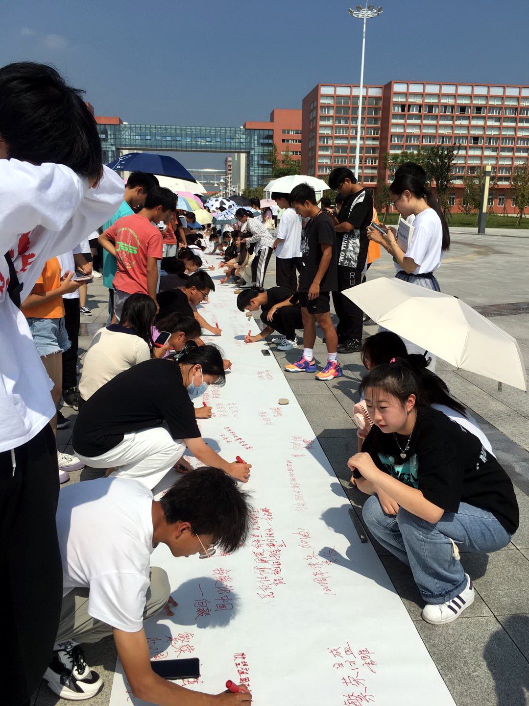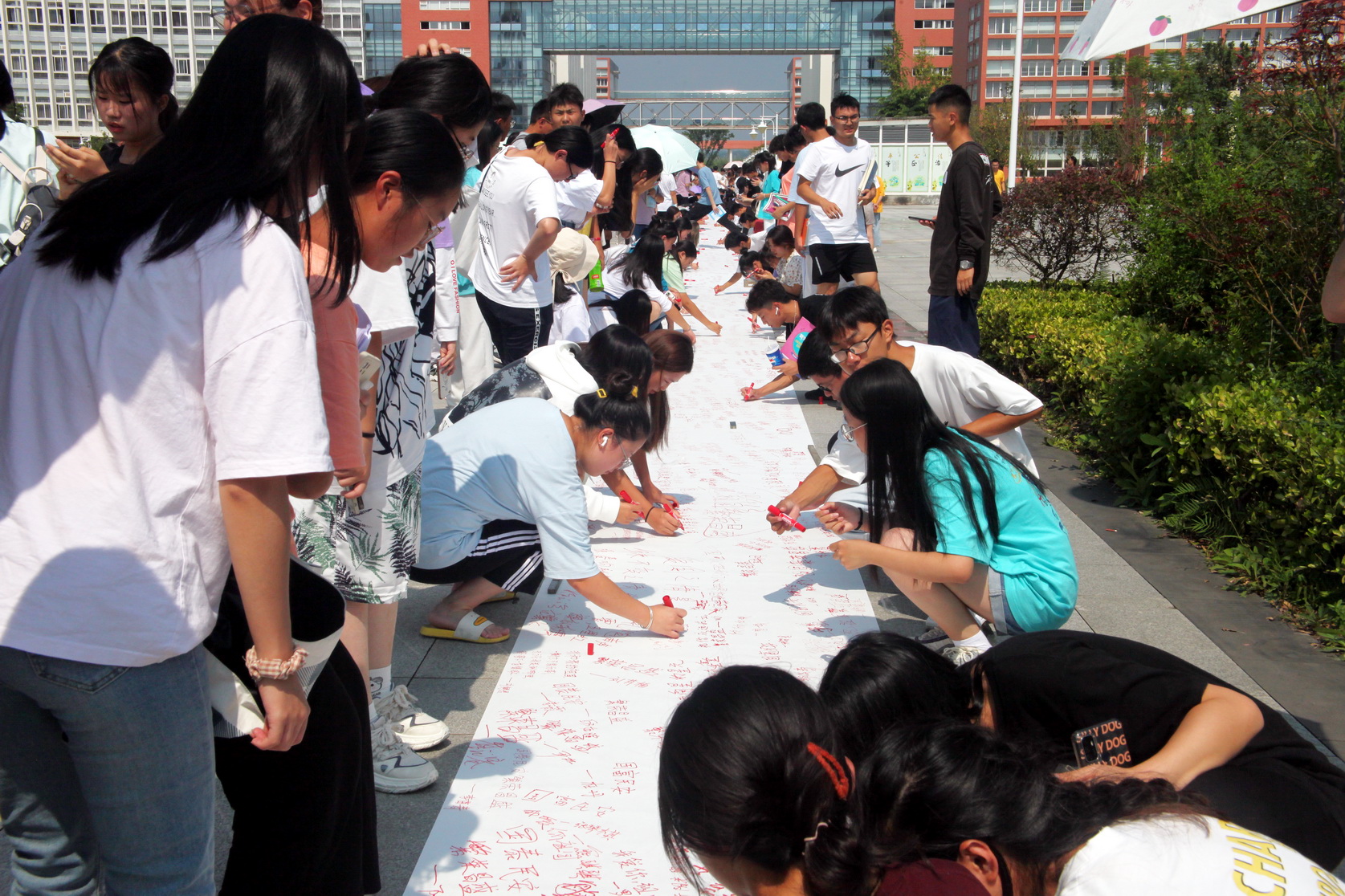 9月30日中午12:40,经精心筹备,beat365英国官方网站“我爱您,亲爱的祖国”——“百米长卷庆国庆”师生现场书画活动暨万名师生签名祝福祖国活动在图书馆前明德广场准点开场!
