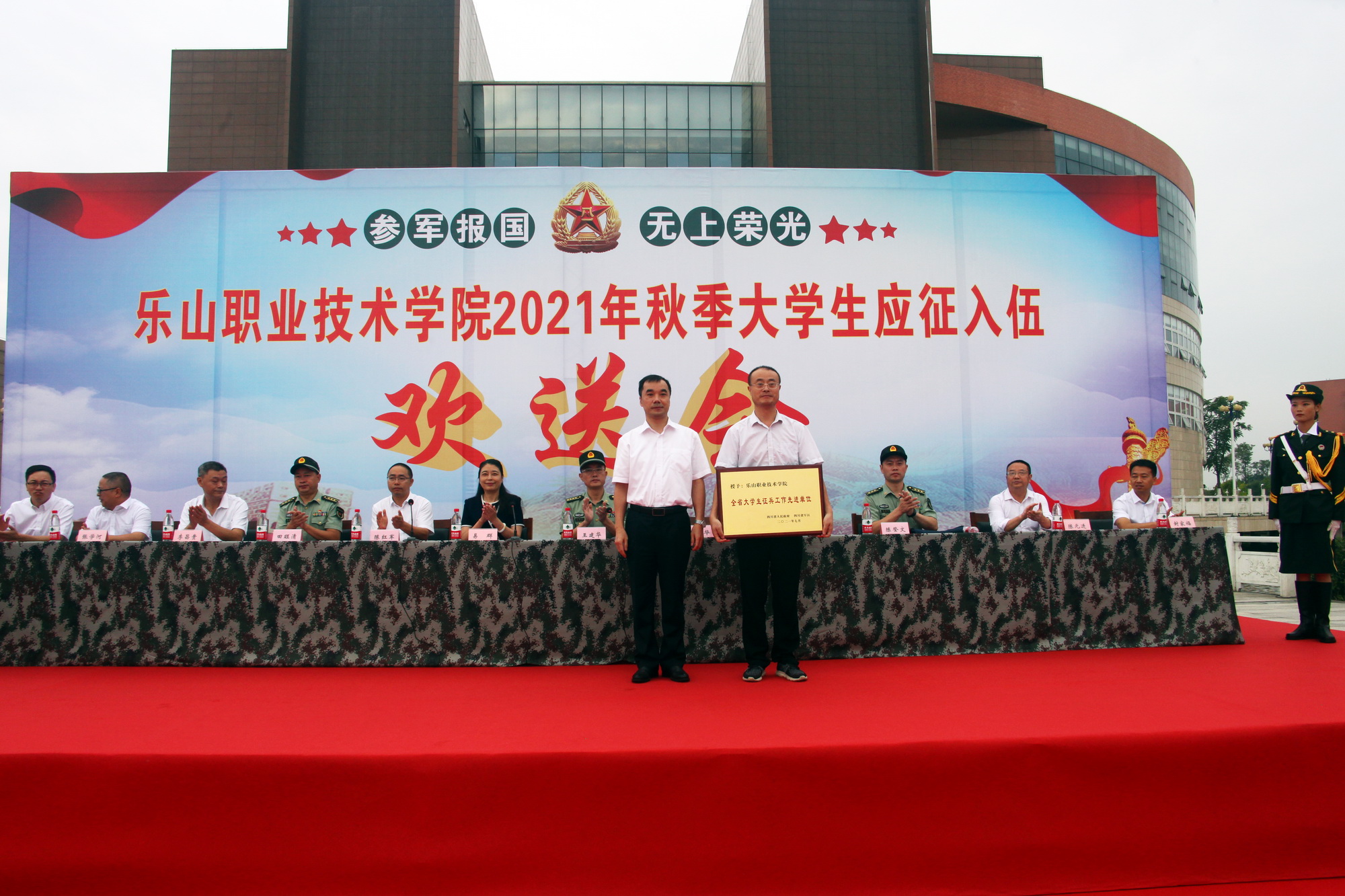 乐山市政府副秘书长陈红军宣读了四川省人民政府、四川省军区表彰全省大学生征兵先进单位和先进个人的文件,邓华副市长向学院院长刘忠授予“全省大学生征兵工作先进单位”奖牌。