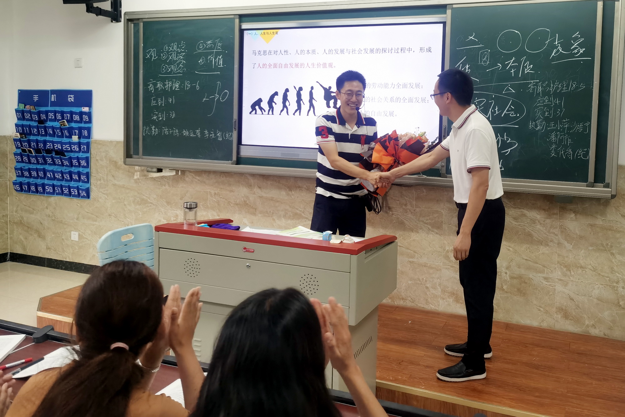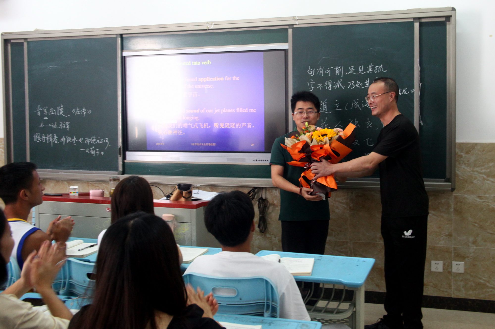 “鲍老师,您辛苦了,节日快乐!” 9月10日教师节一早,学院党委书记易群走进了4号实训楼306教室,将手里捧的一束鲜花递给了财经管理系青年教师鲍敏的手中。“好漂亮呀!没想到教师节当天能收到易书记送的鲜花,太惊喜了。”鲍老师开心地接过易书记送的鲜花,同学们也及时献上了祝福的掌声。