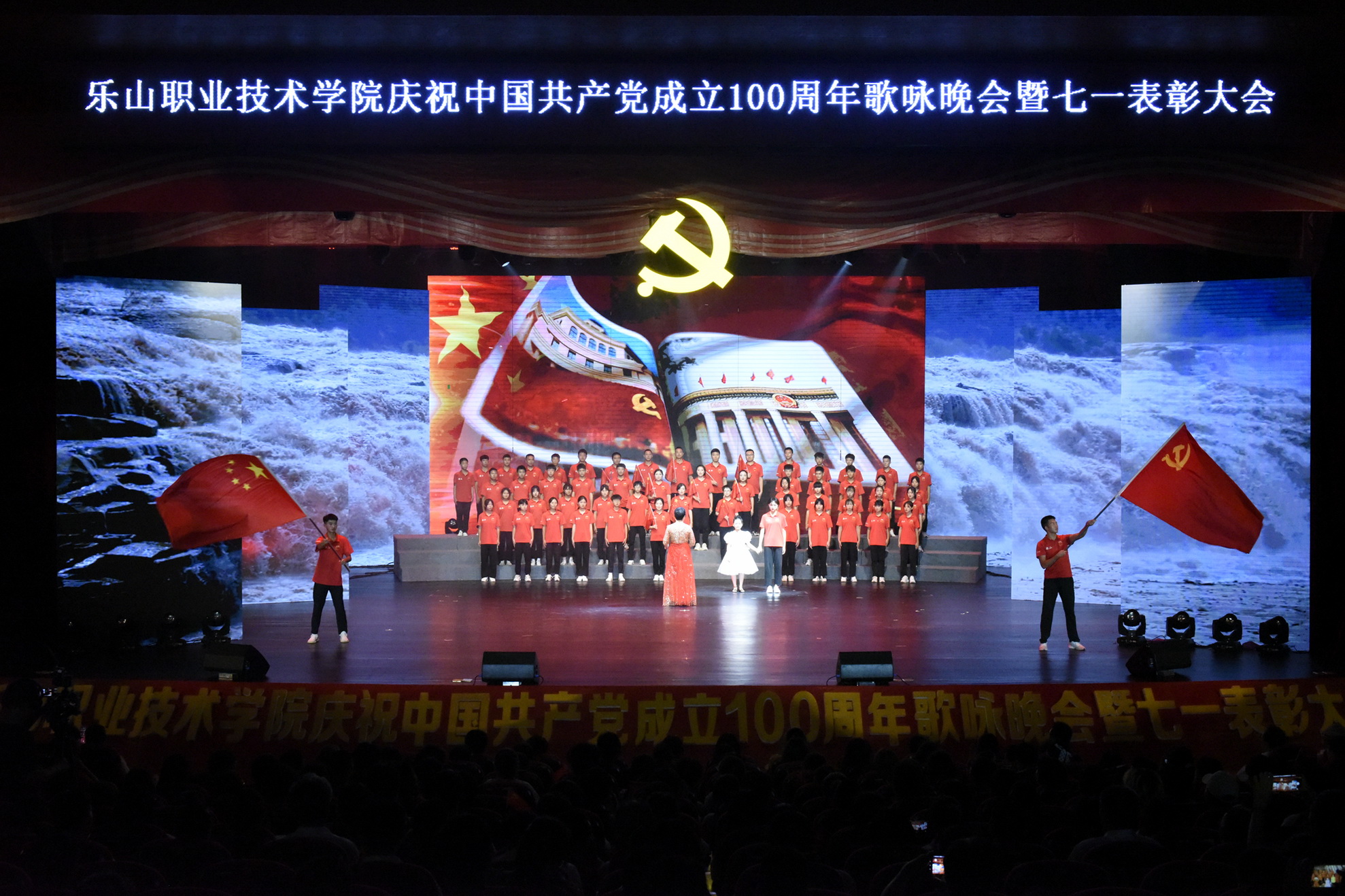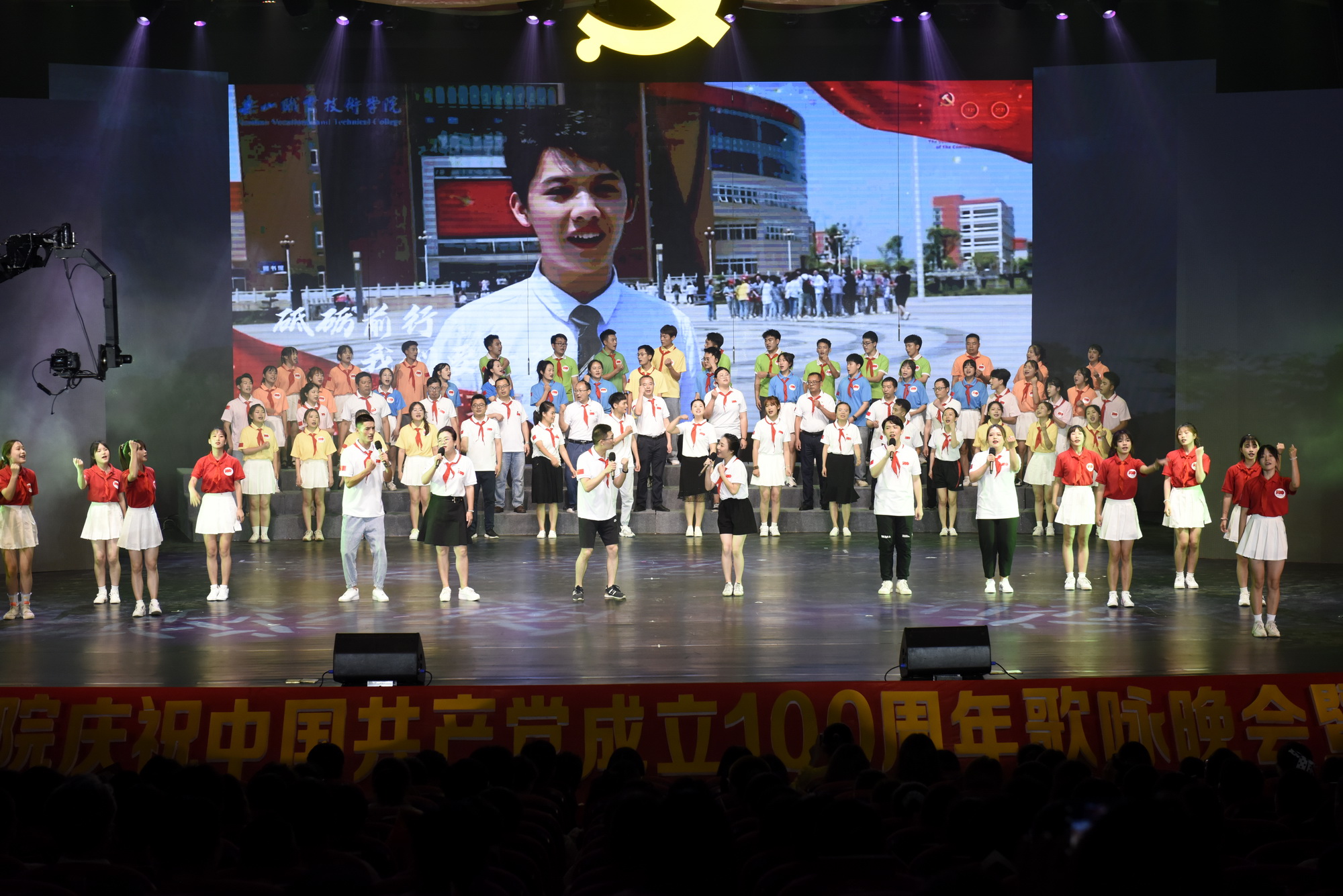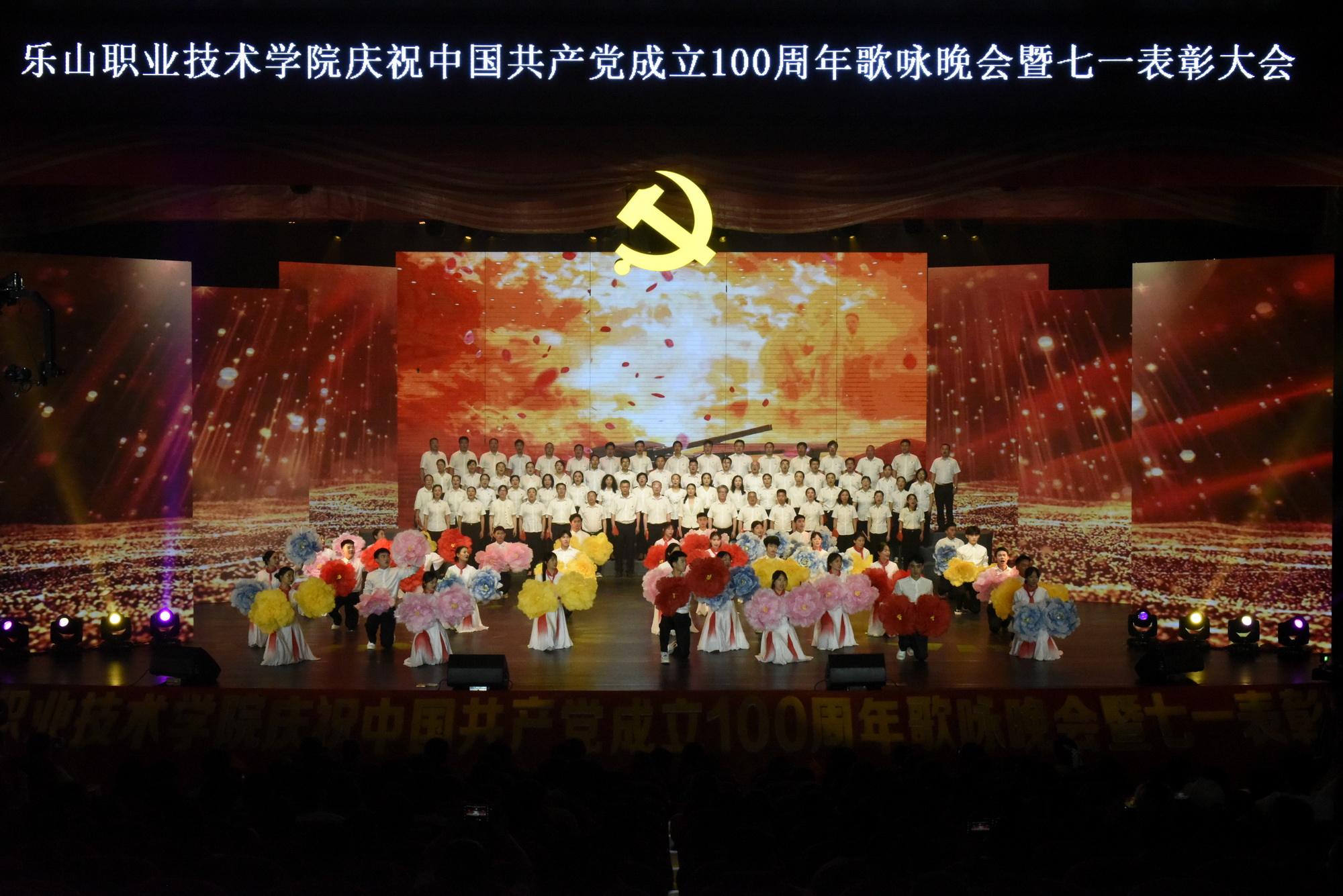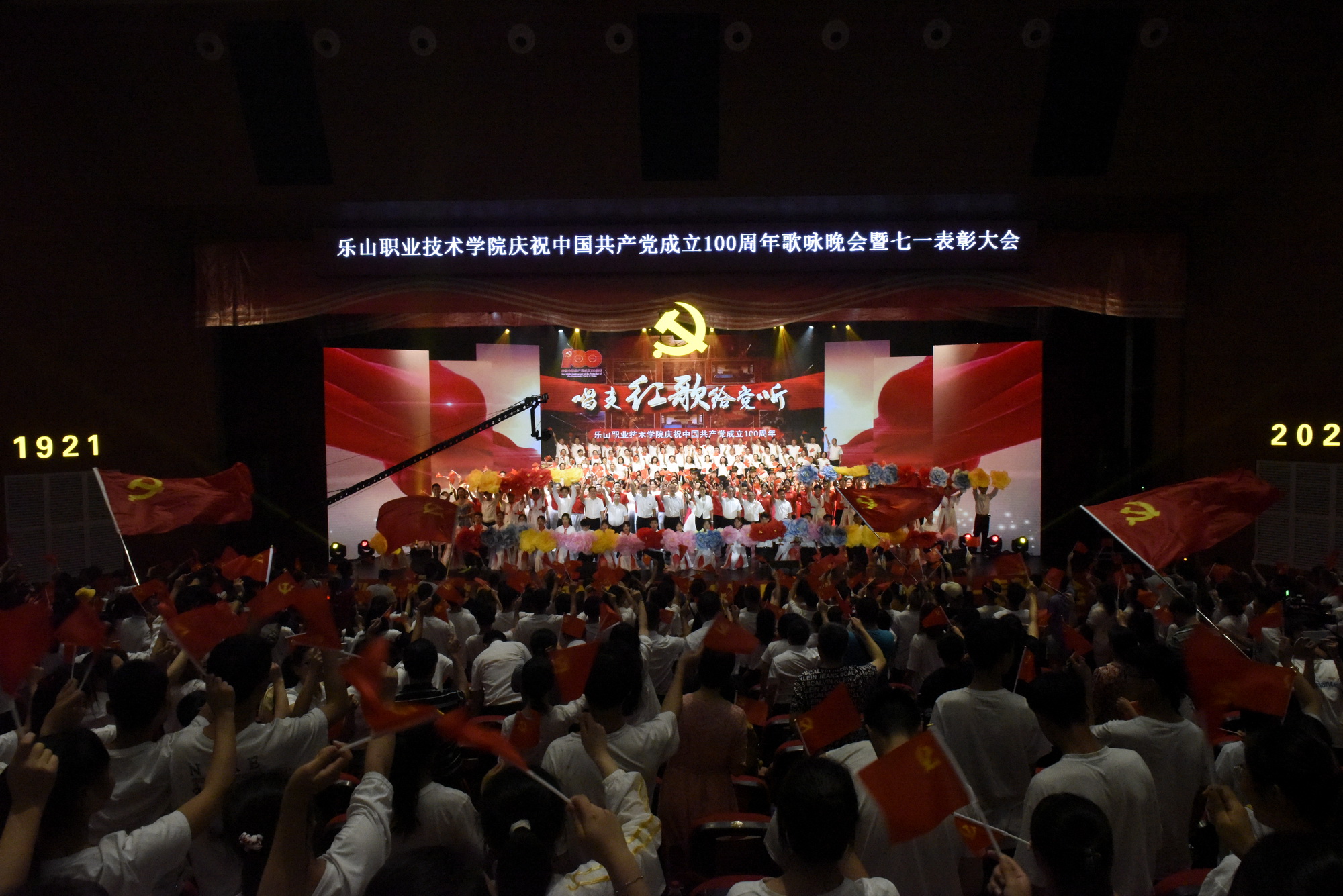 2021年6月30日晚,全院教职工、学生代表1700余人共聚学院礼堂,学院庆祝中国共产党成立100周年歌咏晚会暨“七一”表彰大会隆重举行。
