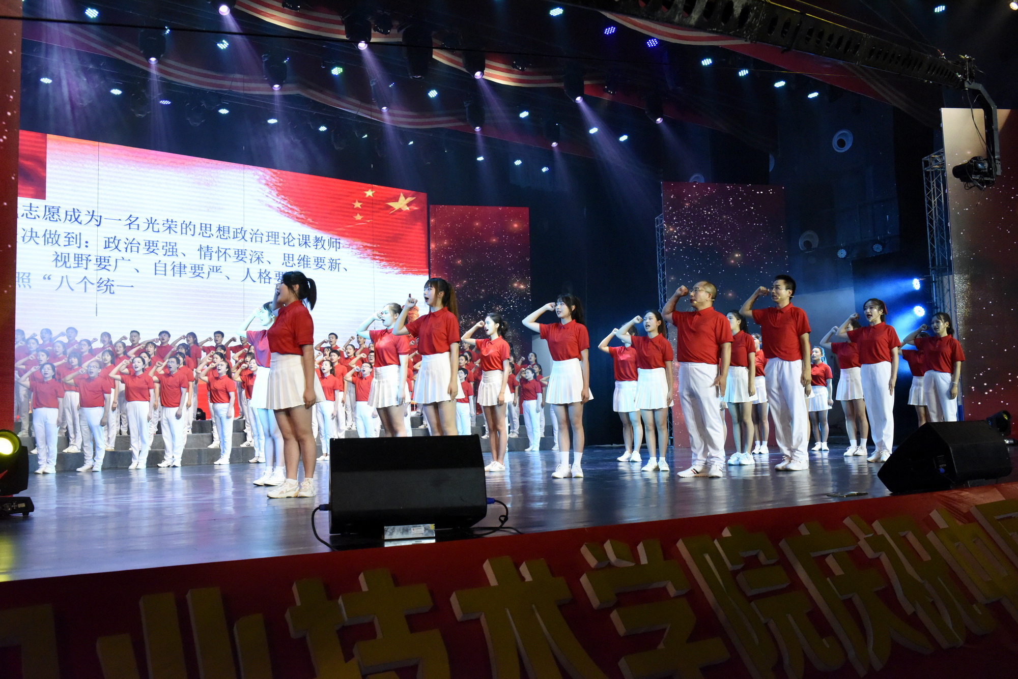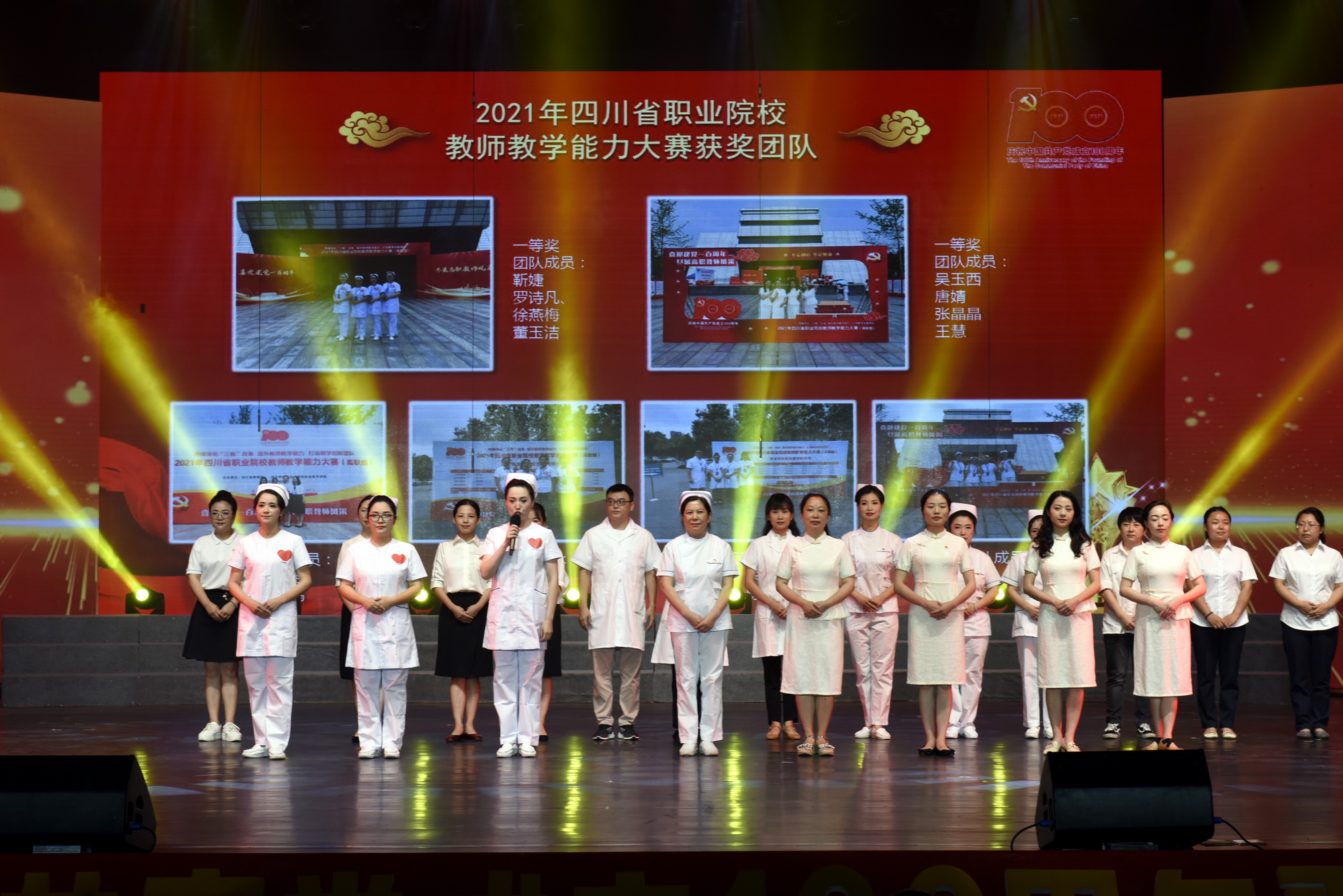 表彰大会上,刚参加完四川省职业教育教学能力大赛获得一等奖、二等奖的6支教学团队全体教师登上舞台,护理团队负责人靳婕、对外汉语团队负责人吴玉西代表获奖团队表达了对党的深情祝福。