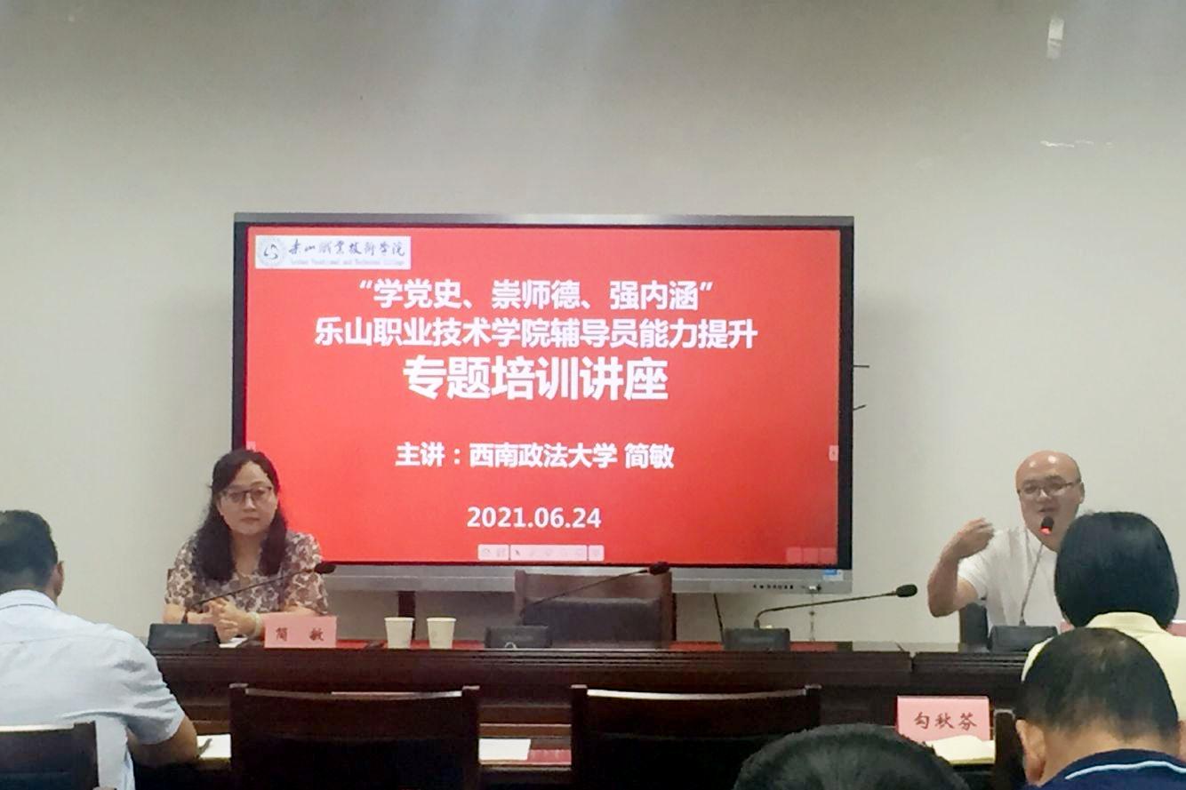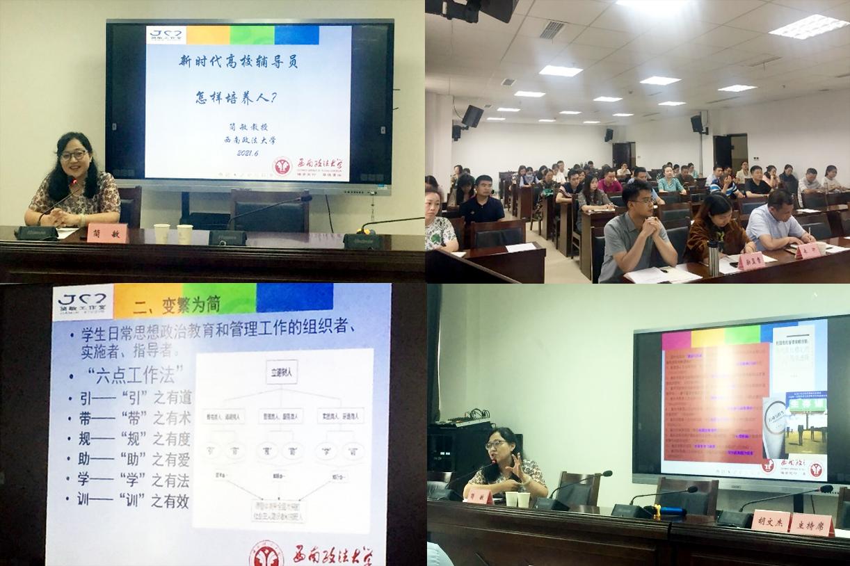 2021年6月24日上午,beat365英国官方网站党委学生工作部在行政楼401会议室举办了“学党史、崇师德、强内涵”辅导员能力提升专题讲座。全国“最美”辅导员、重庆市教授型专职辅导员、西南政法大学简敏教授以“新时代高校辅导员如何培养人”为主题做了专题报告。学院各系(部)党总支专职副书记、学工办老师、全体专兼职辅导员共70余人参加了讲座。讲座由党委学生工作部部长胡文杰主持。