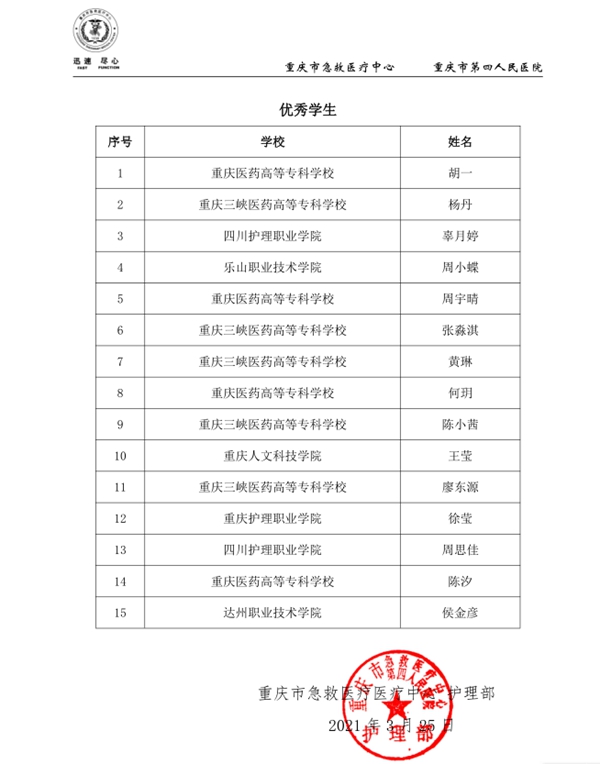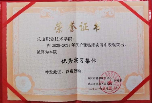 近日,我院护理系2021届护理专业重庆市急救医疗中心实习小组在众多学校实习小组中脱颖而出,被授予“2020-2021年度护理实习生优秀集体”荣誉称号!