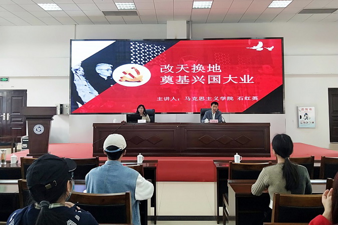 本次报告会以“改天换地 奠定兴国大业”为主题,开展“新中国史”主题教育,用翔实的数据、具体的案例、生动的图片等形式,讲述了1949年中华人民共和国成立到1956年基本完成社会主义改造的重大历史事件,包括新中国成立之初民主革命的遗留任务、执政之初党的考验和党的任务、抗美援朝、全面恢复国民经济、全国人民代表大会“一大”的召开、三大改造与社会主义制度的确立等,深刻阐述这段历史的重大历史意义。