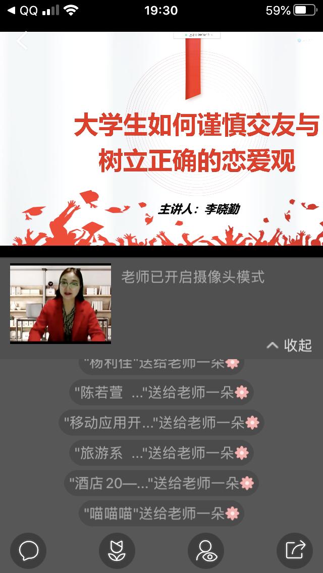 为了帮助学生树立正确的恋爱观,2021年2月28日晚,学院学生工作部邀请马克思主义学院副教授李晓勤老师以线上直播的形式,举办了主题为“大学生如何谨慎交友,如何树立正确的恋爱观”的专题讲座,全院各班级学生在辅导员的组织下进行学习。