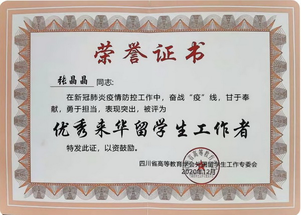 近日,因在2020年新冠疫情期间留学生管理工作中勇于担当、甘于奉献,我院国际合作与交流处张晶晶老师被四川省高等教育学会外国留学生工作专委会评为“优秀来华留学生工作者”。