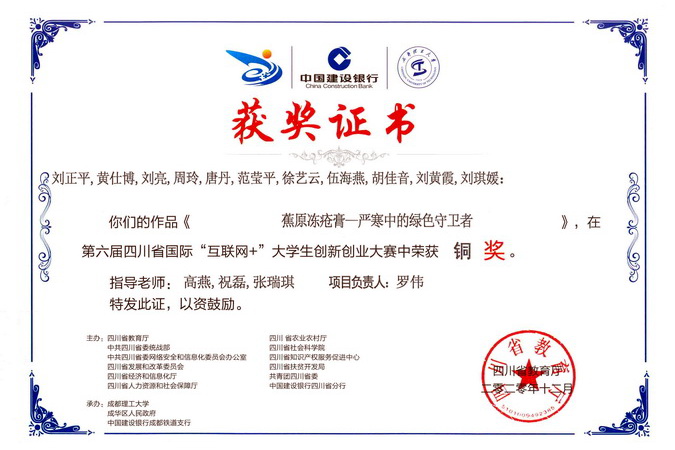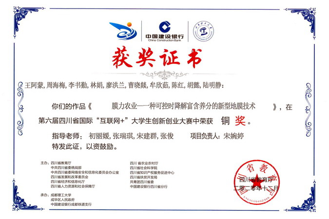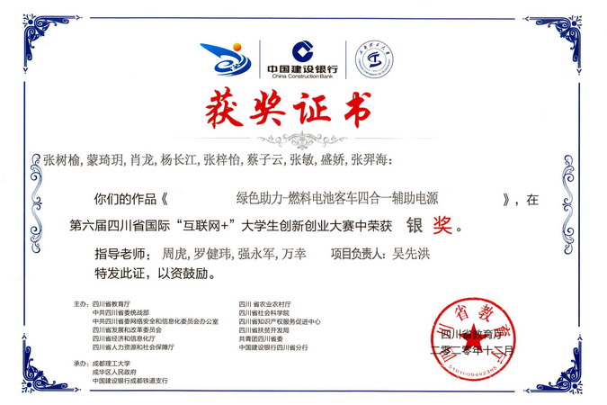 近日,第六届四川省“互联网+”大学生创新创业大赛公布了获奖名单,学院参赛团队荣获省级银奖1项,铜奖5项。其中机电工程系吴先洪负责项目《绿色助力-燃料电池客车四合一辅助电源》(指导教师:周虎、罗健玮、强永军)获得省级银奖;药学系项目《土地卫士—一种可控时降解富含养分的新型地膜技术》《蕉原冻疮膏-严寒中的绿色守卫者》《烯氟科技---新型智能石墨烯复合材料除氟设备开创者》《智能中药智囊机—全球唯一智能化中药提取智囊一体化设备》、财经管理系项目《华享众创信息技术服务有限公司》5个项目获得省级铜奖。