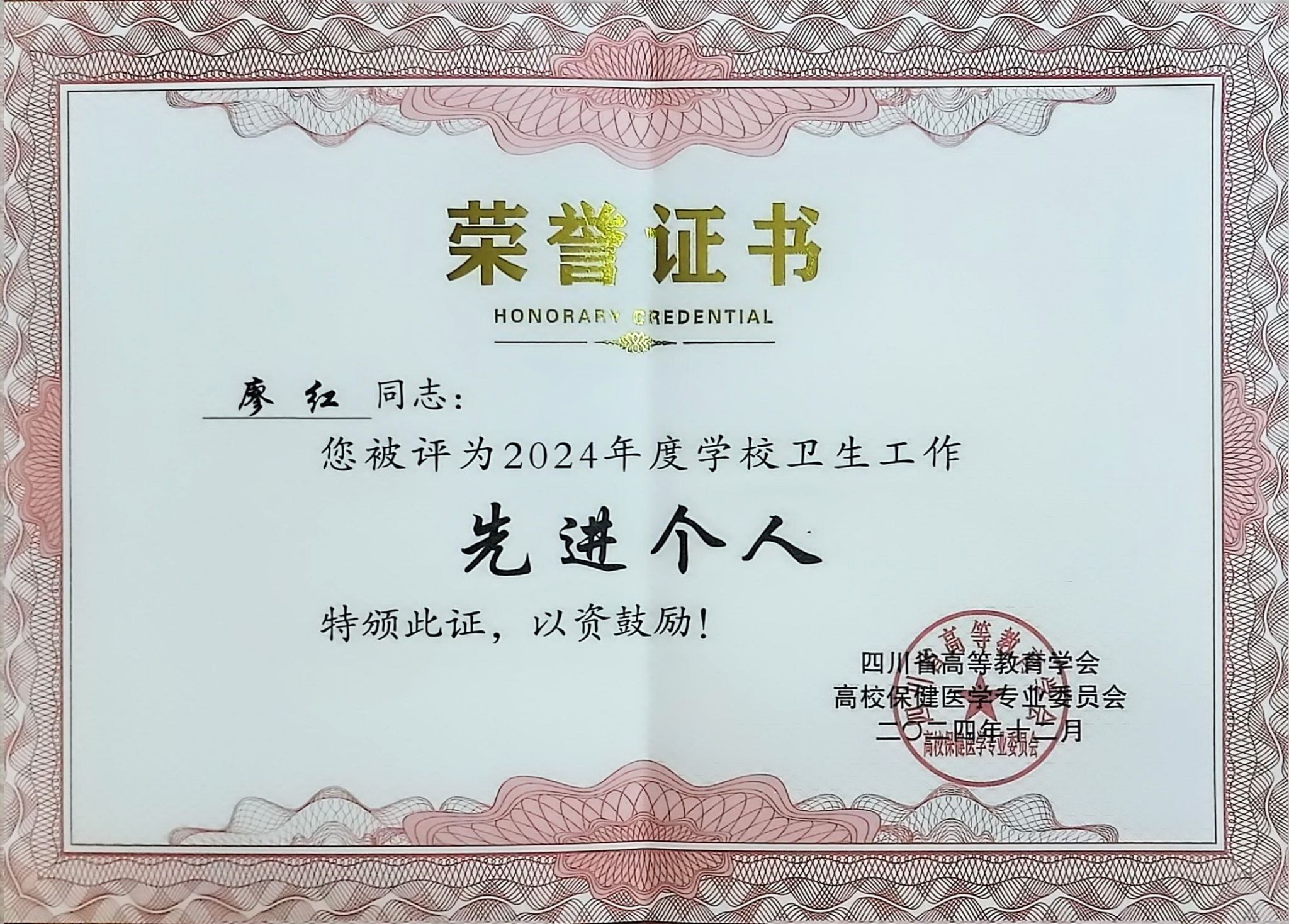近日,四川省高等教育学会高校保健医学专业委员会对四川大学、电子科技大学等全省29所高校授予“2024年度学校卫生工作先进单位”,并对32名“2024年度学校卫生工作先进个人”予以表彰。beat365英国官方网站荣获“2024年度学校卫生工作先进单位”,廖红荣获“2024年度学校卫生工作先进个人”。