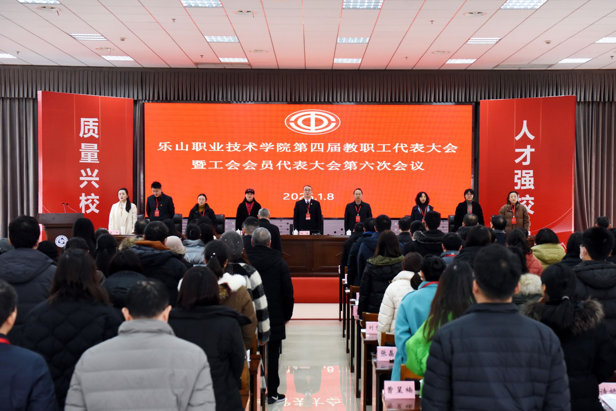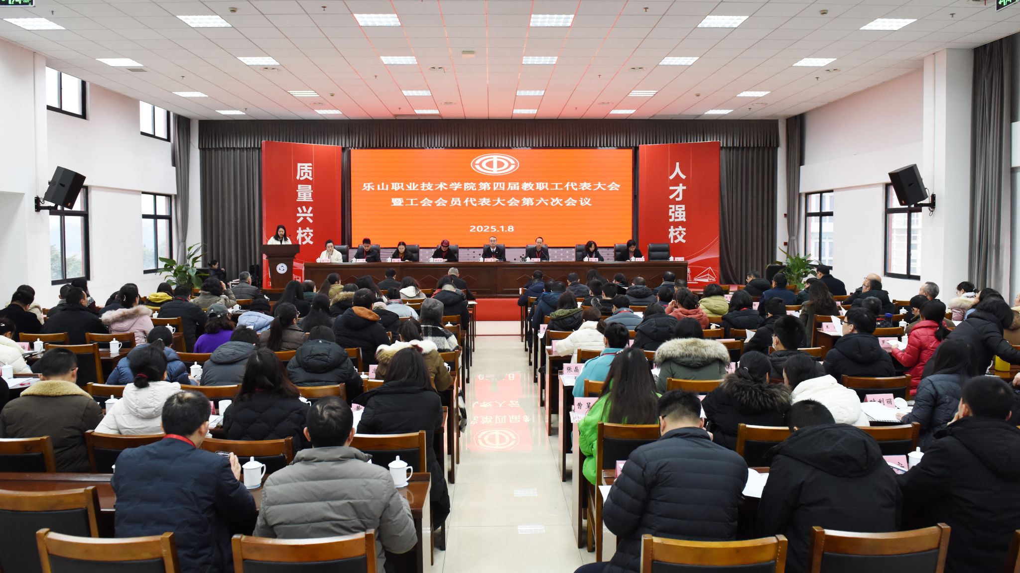 2025年1月8日,beat365英国官方网站第四届教职工代表大会暨工会会员代表大会第六次会议在学术交流中心召开。校长刘忠,党委副书记、工会主席张佳出席会议。党委委员、纪委书记李昌贵,党委委员、副校长陈元进、封家福、周芹特邀列席。教代会81名代表参加会议,非教代会代表的党委委员、中层干部列席会议。