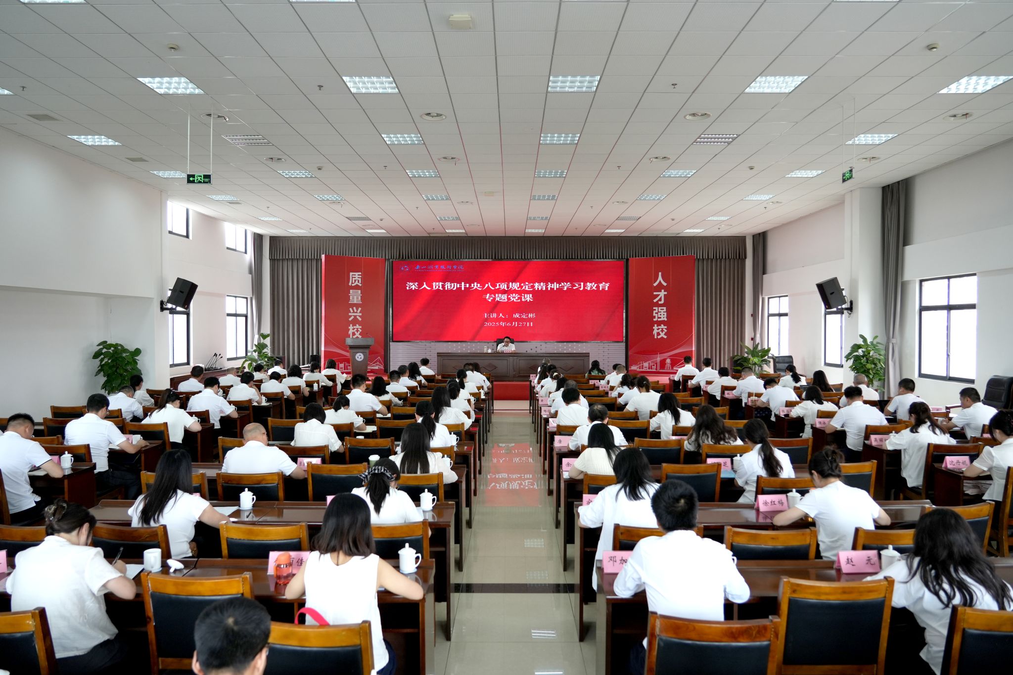 6月28日,学校党委书记为党员干部讲授深入贯彻中央八项规定精神学习教育专题党课。全体在家校领导、中层干部、马克思主义学院教工一党支部全体党员、党员师生代表聆听党课。