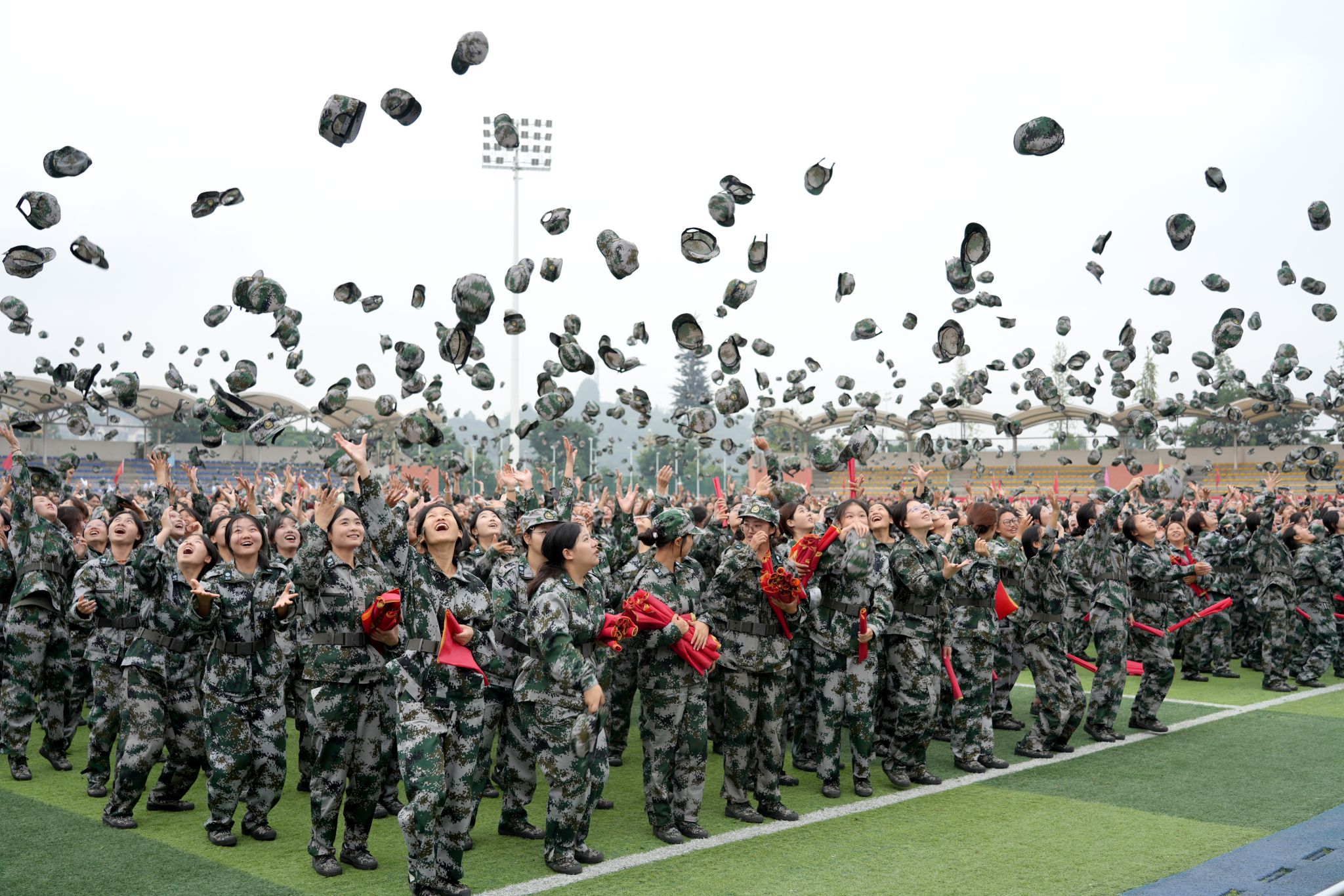 分列式结束后,精彩纷呈的军事科目汇报表演将现场气氛推向高潮。男子军体拳方队动作刚劲有力,喊声震天,尽显阳刚之气;女子匕首操方队步伐敏捷,动作精准,巾帼不让须眉;当欢快的旋律划破天际,1500名学子组成的花式方阵如江河奔涌般入场。激昂的《中国人》旋律此刻响起,这首诞生于香港回归之年的爱国金曲,在青衣江畔焕发出崭新的青春力量!从"铭记"历史到"拓梦"未来,从"团结"一心到"中华"腾飞,八个大字随歌词次第“绽放”,与旁侧方队的手语操交相辉映,无声的赤诚与有声的宣言共同谱写着爱国乐章;“诚信、笃志、求真、创新"的八字校训,不仅是方阵中流动的风景,更是同学们未来前行的风向标。当校训字样渐隐,鲜红的党徽已在方阵中央熠熠生辉,1500颗年轻的心在这一刻与党的脉搏同频共振!整个表演过程组织严密,衔接流畅,充分展示了本次军事训练的丰硕成果。