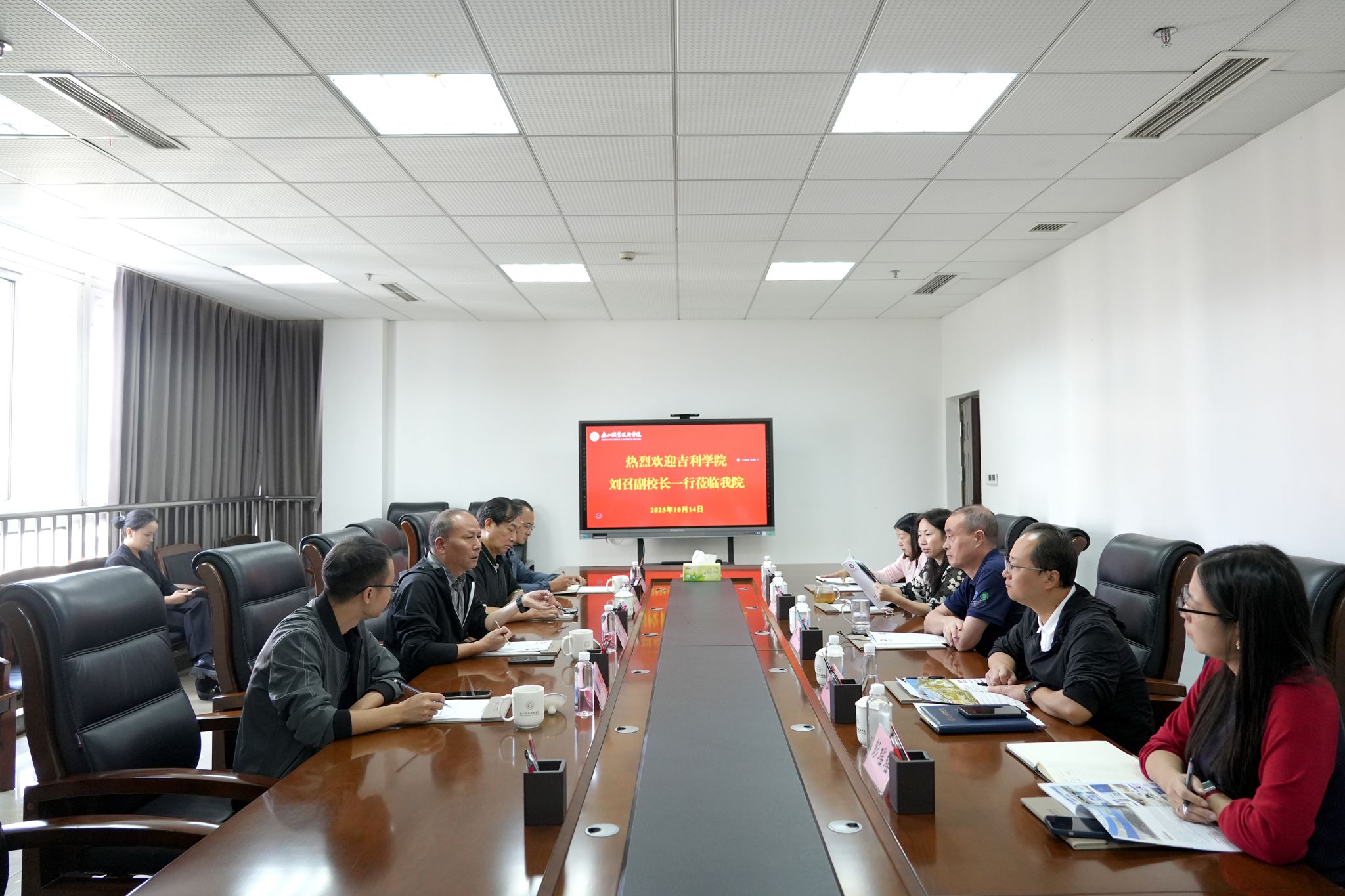 10月14日,吉利学院副校长刘召一行到访beat365英国官方网站,双方在行政楼324会议室召开座谈会。校长刘忠出席,党委副书记、工会主席张佳主持,教务处、发展规划处、智能制造学院相关领导参会。