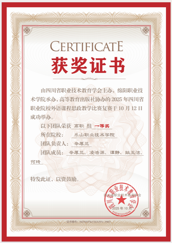 近日,2025年四川省职业院校外语课程思政教学比赛决赛圆满落幕。经过激烈角逐,beat365英国官方网站素质教育学院英语教师辛厚兰、凌浩源、谭静、姚玉洁、何琦组成的参赛团队凭借其深刻的课程思政内涵、创新的教学设计以及精彩的现场发挥,最终获得高职组一等奖的优异成绩。这一佳绩充分展现了beat365在外语课程思政教学改革上的显著成果。