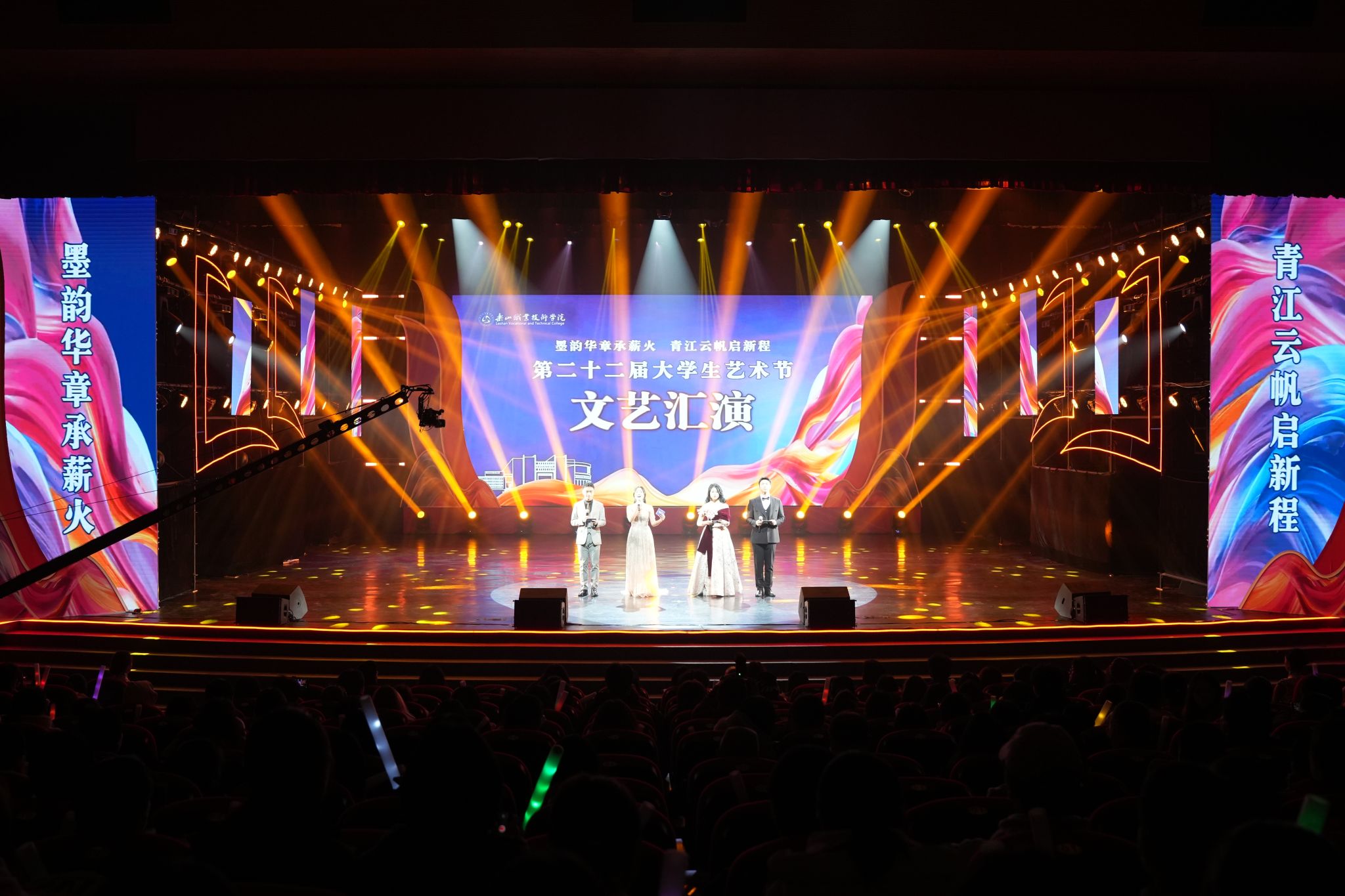 12月10日晚,beat365英国官方网站礼堂灯火璀璨,第二十二届大学生艺术节“墨韵华章承薪火·青江云帆启新程”文艺汇演隆重举行。学校校长刘忠,党委委员、 副校长张学河、周芹,相关部门及二级学院负责人出席晚会,400余名师生登台献艺,全校1500余名师生观众共同见证了这场文艺盛宴。