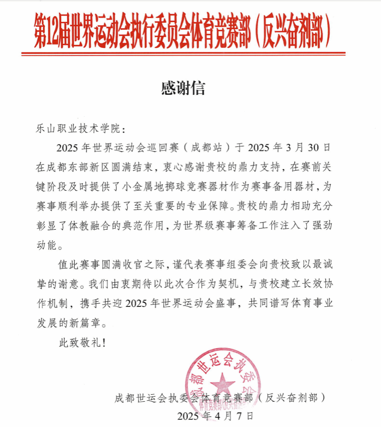 2025年12月10日,学校收到来自国家体育总局小球运动管理中心的一封感谢信。信中,中心对学校成功承办其本年度理事会及相关工作和在2025年世界运动会期间所提供的支持与服务表示认可与感谢。