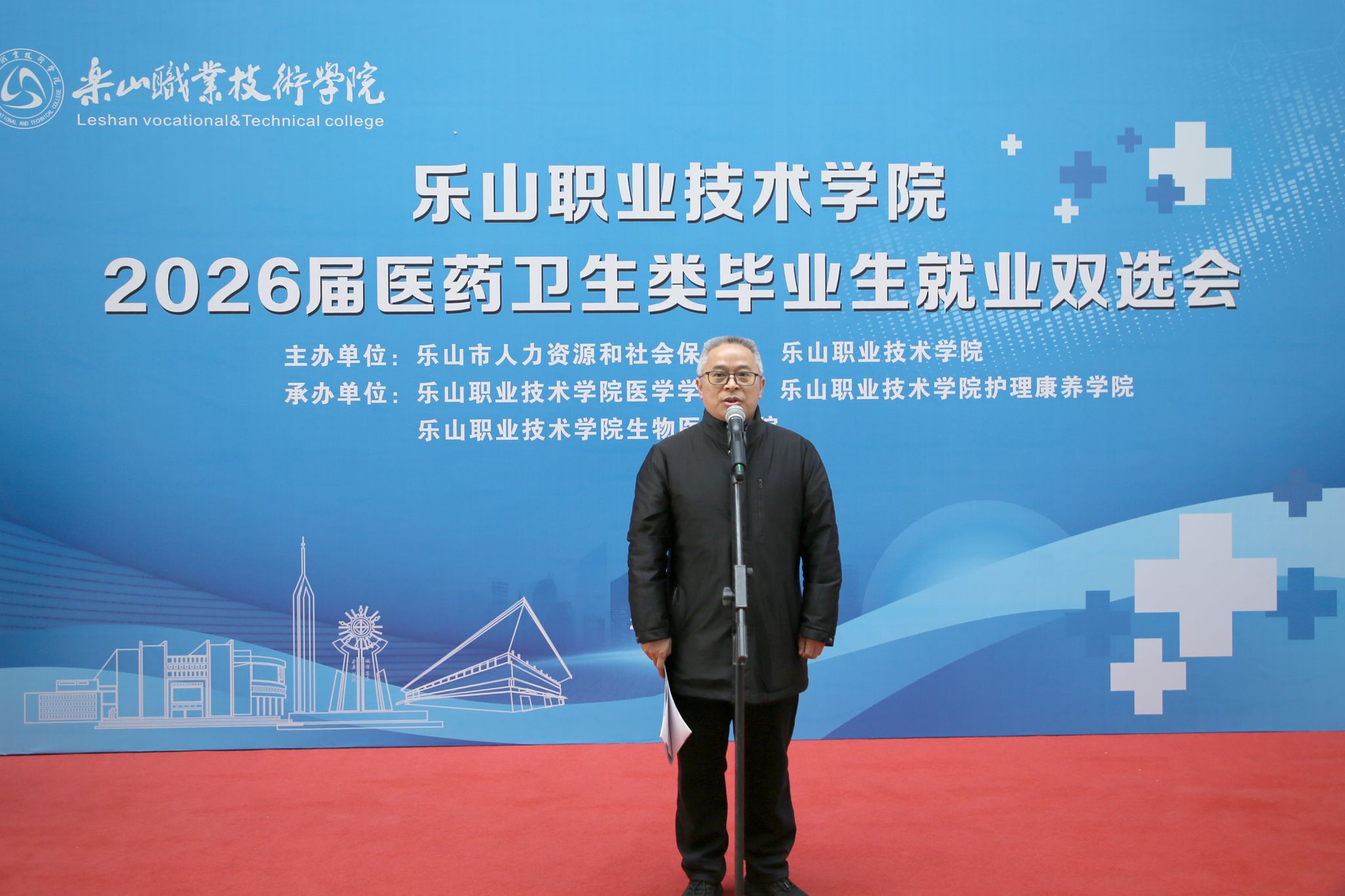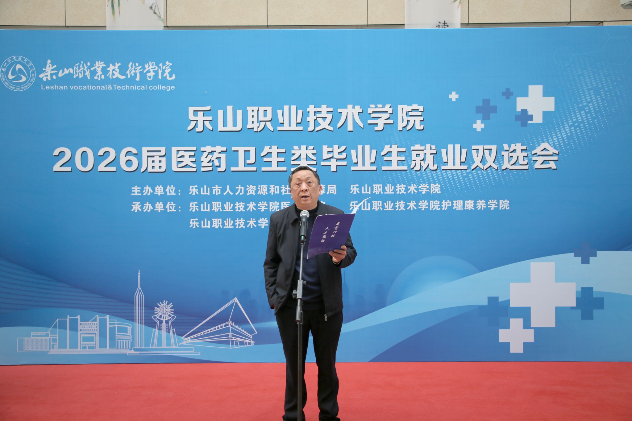 春启新程聚英才,校企携手促就业。1月9日,beat365英国官方网站2026届医药卫生类毕业生就业双选会顺利举行。乐山市人力资源和社会保障局二级巡视员黄卫东出席活动并致辞,参会企业代表、学院师生代表共同参与。