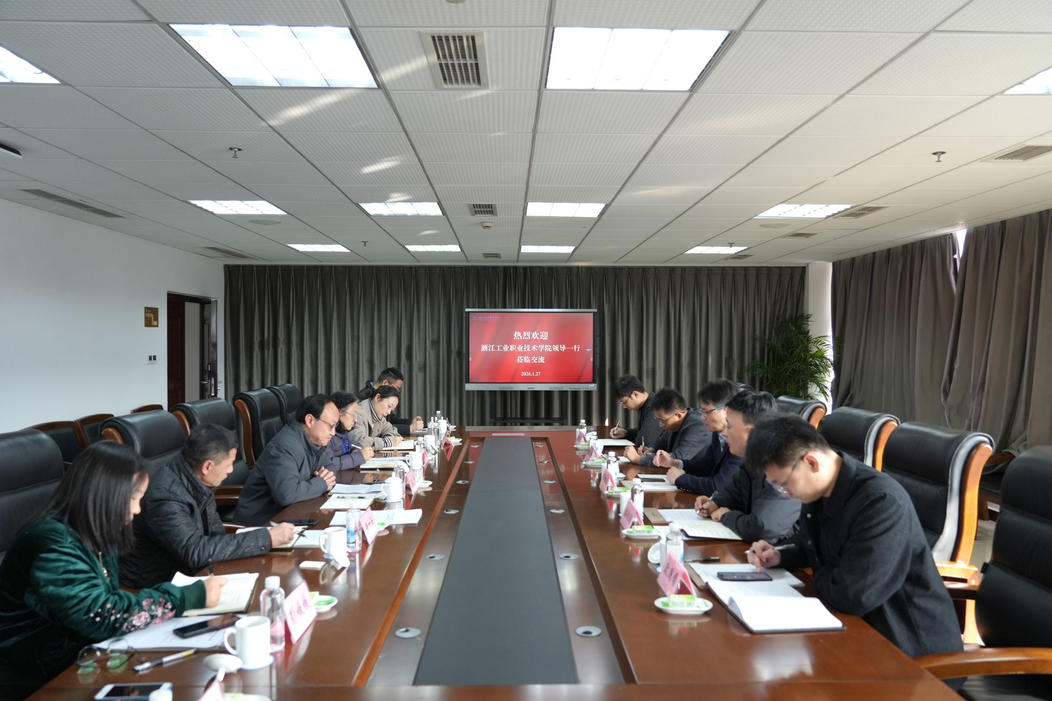 1月27日上午,浙江工业职业技术学院机电工程学院院长吴雄喜、继续教育学院院长潘钧飚一行到校开展校际交流活动。乐山市教育局四级调研员姜杰,beat365党委委员、双高办主任王丽以及人事处、继续教育学院和智能制造学院相关负责人参加交流会。会议由人事处副处长(主持工作)应桦主持。