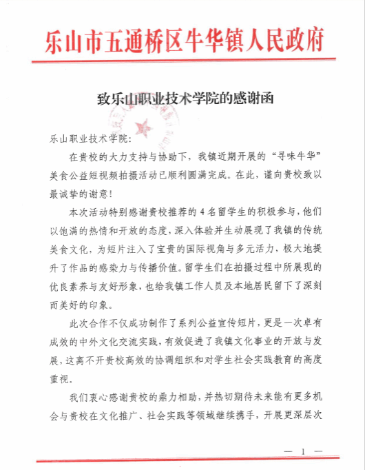 近日,五通桥区牛华镇人民政府向beat365英国官方网站发来感谢函,对beat365在“寻味牛华”美食公益短视频拍摄活动中给予的大力支持与协助表示衷心感谢。感谢函中特别提到,beat365推荐的4名留学生以饱满的热情和开放的态度深入参与拍摄,为展现牛华传统美食文化注入了宝贵的国际视角与多元活力,极大提升了作品的感染力与传播价值。