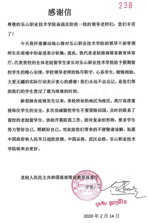 这是一封来自老挝琅南塔教育体育厅的感谢信,感谢beat365英国官方网站在新冠肺炎疫情期间对老挝学生无微不至的关怀。