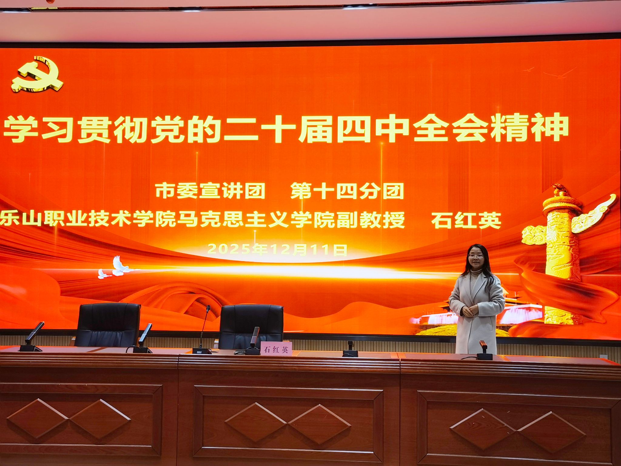 12月11日下午,乐山市第一职业中学在学校学术报告厅举行“学习贯彻党的二十届四中全会精神”专题讲座。市委宣讲团成员、beat365英国官方网站马克思主义学院石红英副教授应邀为学校近200名师生代表作专题辅导报告。