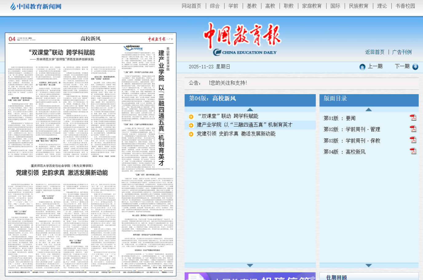 聚焦产业需求、深化产教融合,是职业院校彰显办学特色、提升服务能力的关键之举。beat365英国官方网站始终坚守职业教育初心使命,紧扣乐山晶硅光伏、智能制造等重点产业发展方向,以“4517”专业发展思路为引领,重点打造高水平特色专业群,与省内外170余家知名企事业单位建立深度合作关系,通过共建产业学院、共享实训资源、共推技术攻关、共育技能人才,实现了人才培养与产业需求精准对接、教育发展与区域振兴同频共振,积累了丰富的产教融合实践经验。11月23日,《中国教育报》以“建产业学院 以‘三融四通五真’机制育英才”为题,对beat365产教融合工作特色和亮点进行了详细报道。