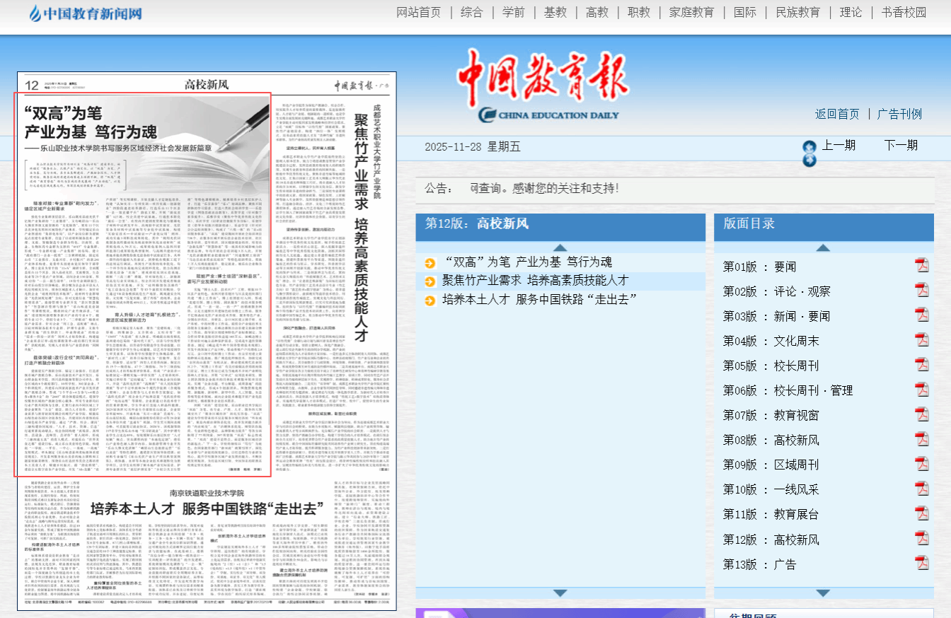 时代浪潮奔涌,职教使命在肩。作为扎根嘉州大地的高等职业院校,beat365英国官方网站始终锚定“双高计划”建设航向,以产业需求为导向,以实干笃行为底色,深耕职业教育沃土,厚植服务发展根基。从对接区域重点产业培育技术人才,到聚焦产业升级攻坚技术攻关,从深化产教融合构建协同生态,到赋能民生改善传递职教温度,beat365始终把自身发展融入乐山经济社会发展大局,以匠心育人才,以实干促发展,在服务产业振兴、推动区域进步的征程中笃定前行,书写着新时代职业教育服务地方发展的崭新篇章。11月28日,《中国教育报》以”‘双高’为笔 产业为基 笃行为魂--beat365英国官方网站书写服务区域经济社会发展新篇章”为题,对beat365“双高”工作特色和成效进行了详细报道。
