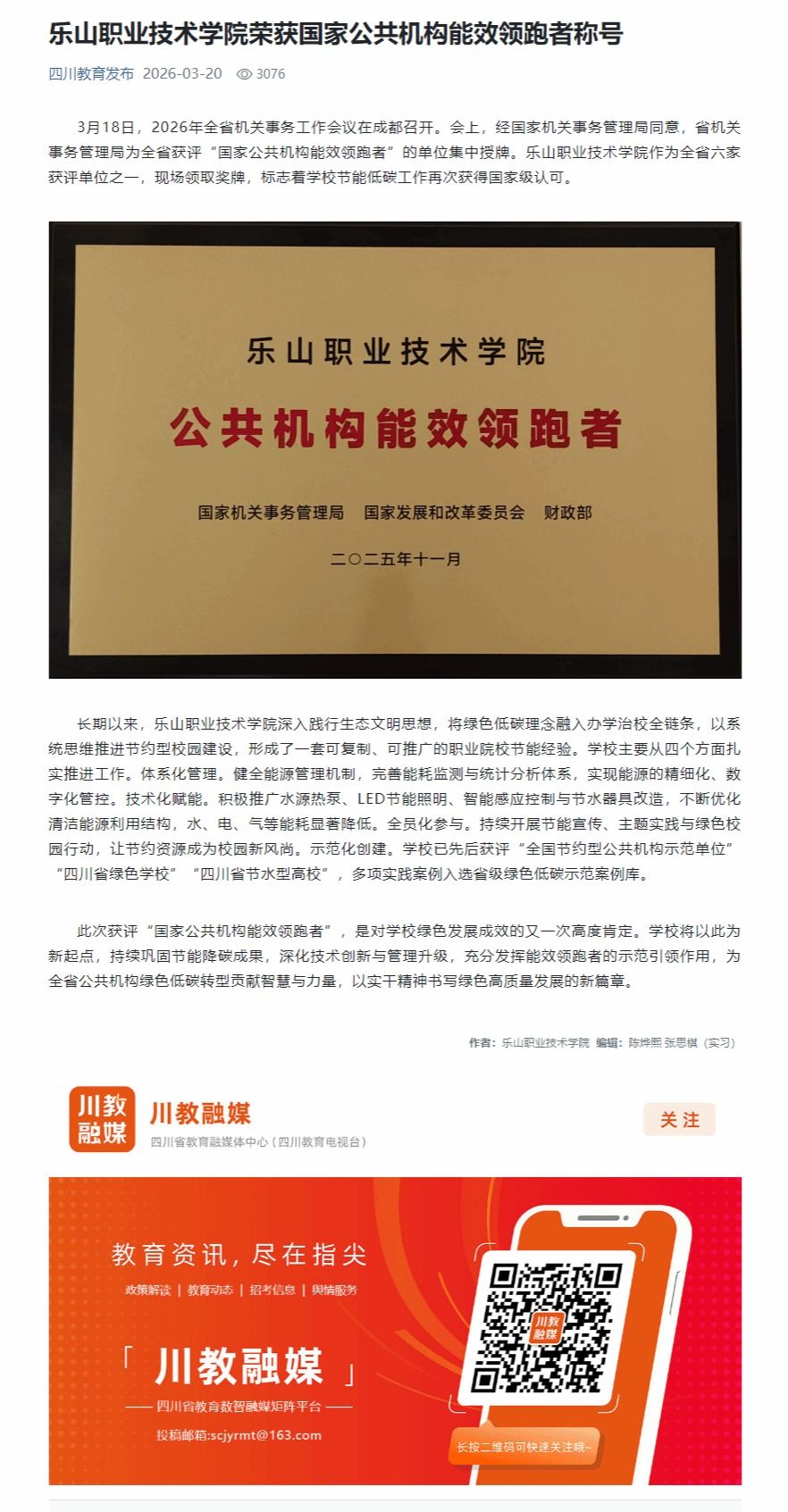 四川教育发布:beat365英国官方网站荣获国家公共机构能效领跑者称号