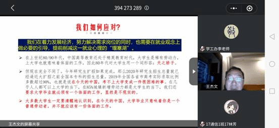 此次云端就业指导活动为期一周,课程设计合理,内容丰富,形式多样,同学们在课堂上频繁与老师互动,认真学习,达到了预期效果。就业指导课的开办,为伟德官网2021届毕业生提早吹响了就业号角,营造了就业氛围,为伟德官网明年就业工作的开展注入强心剂,不失为一场别开生面的就业总动员。