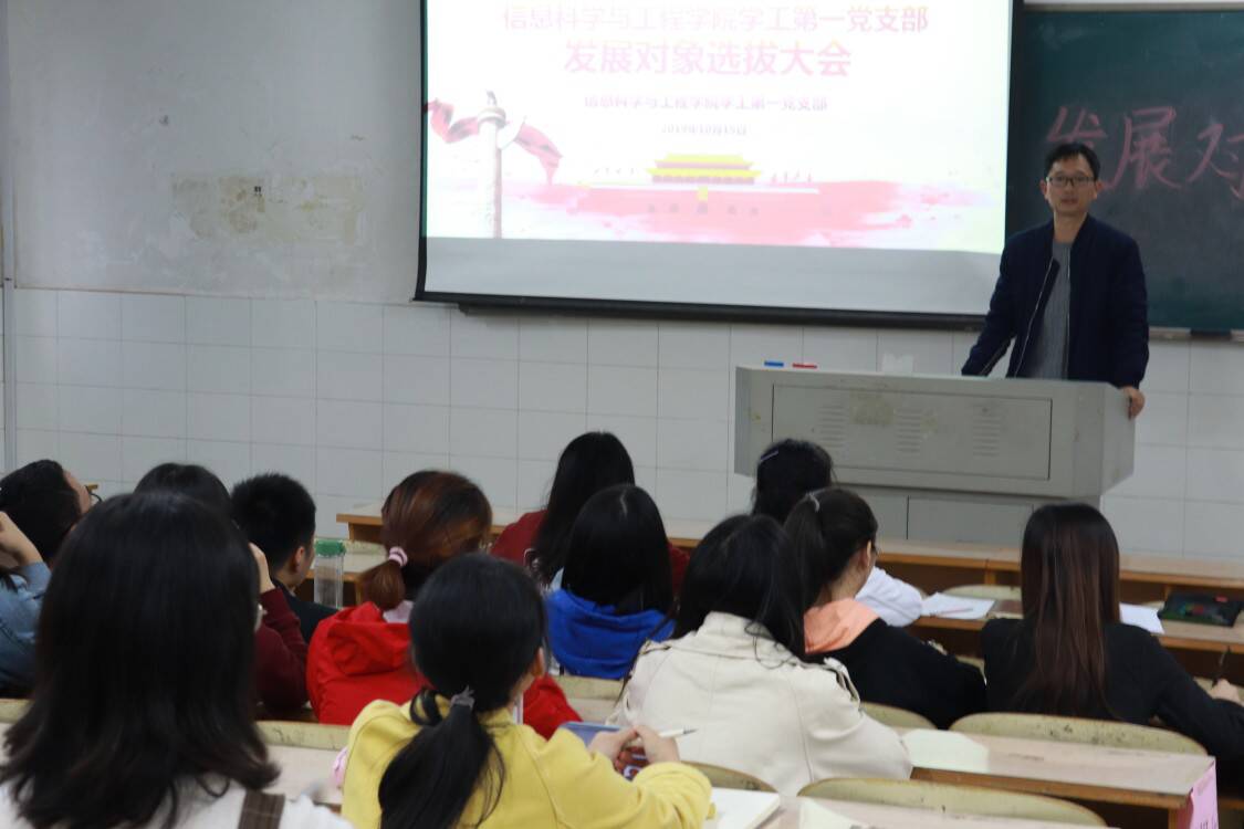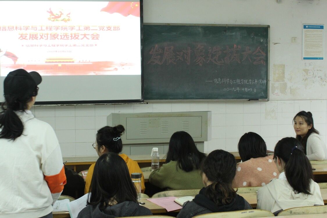 (通讯员 邓世骄 蒋郑菊)为进一步落实伟德官网党组织对优秀人才的选拔工作,深入了解积极分子的思想动态,10月15日下午,信息科学与工程学院学工第一党支部、第二党支部于玉衡楼北栋507、508顺利召开发展对象选拔大会。学工第一党支部书记关红儒同志、学工第二党支部书记唐瑞鸿同志、部分学生党员及33名入党积极分子参加此次会议。