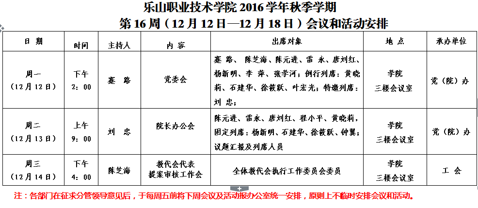 第16周(12月12日—12月18日)会议和活动安排